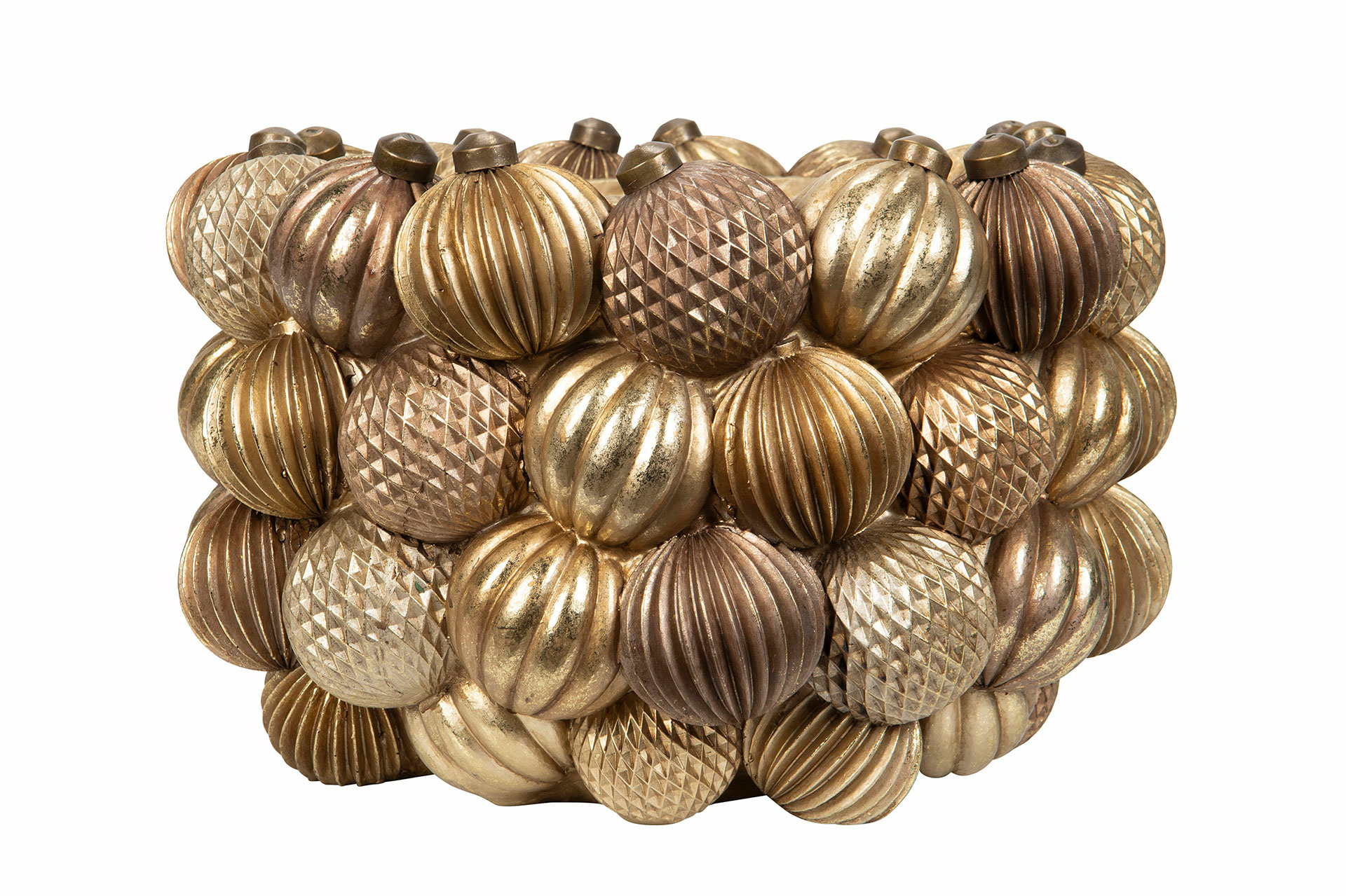 Unik kruka dekorerad med tätt sammansatta julkulor i varma guld- och champagnetoner. De varierande mönstren och ytorna skapar ett levande och festligt uttryck.