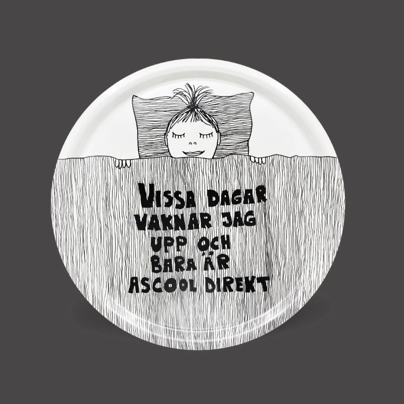 Rund bricka med illustrationen ”Vissa dagar vaknar jag upp och bara är ascool direkt” i svart och vitt.