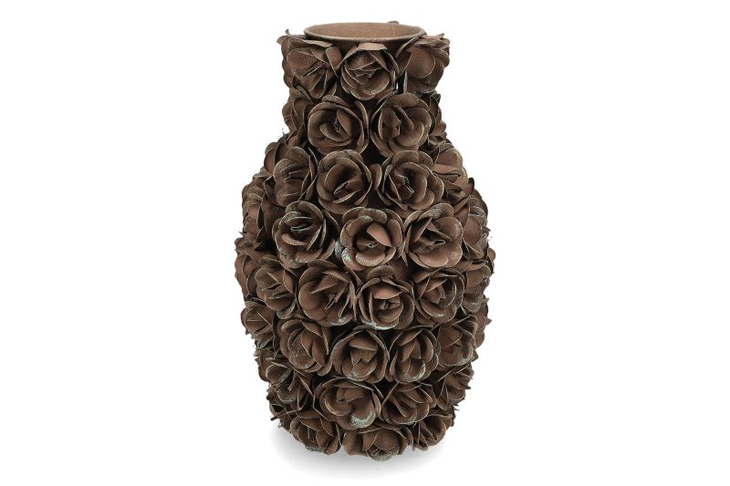 En elegant vas klädd i vackra rosdetaljer som skapar en levande och unik struktur. Den varma bruna tonen ger ett ombonat och naturligt uttryck. Perfekt som dekorativ detalj – lika fin med torkade blommor som helt på egen hand.
