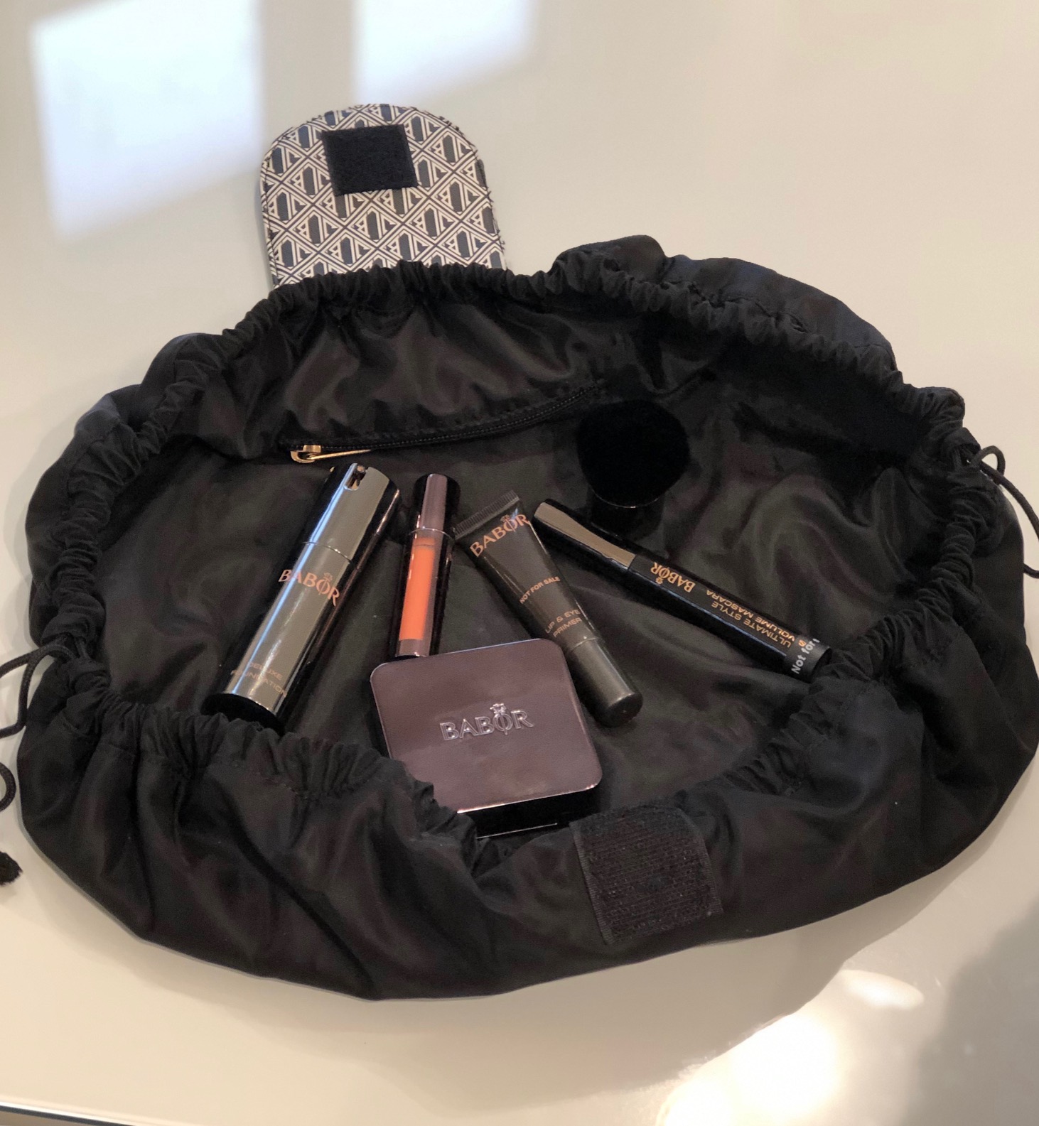 Den ultimata necessären för makeup eller hudvård där du kan få en tydlig överblick på produkterna. Med denna smarta och praktiska makeup väska slipper du sprida ut makeupen i badrummet eller leta efter den där makeup pennan i necessären. Även praktisk när man reser då man snabbt lägger i sina produkter för användning och drar ihop den formbara påsen.