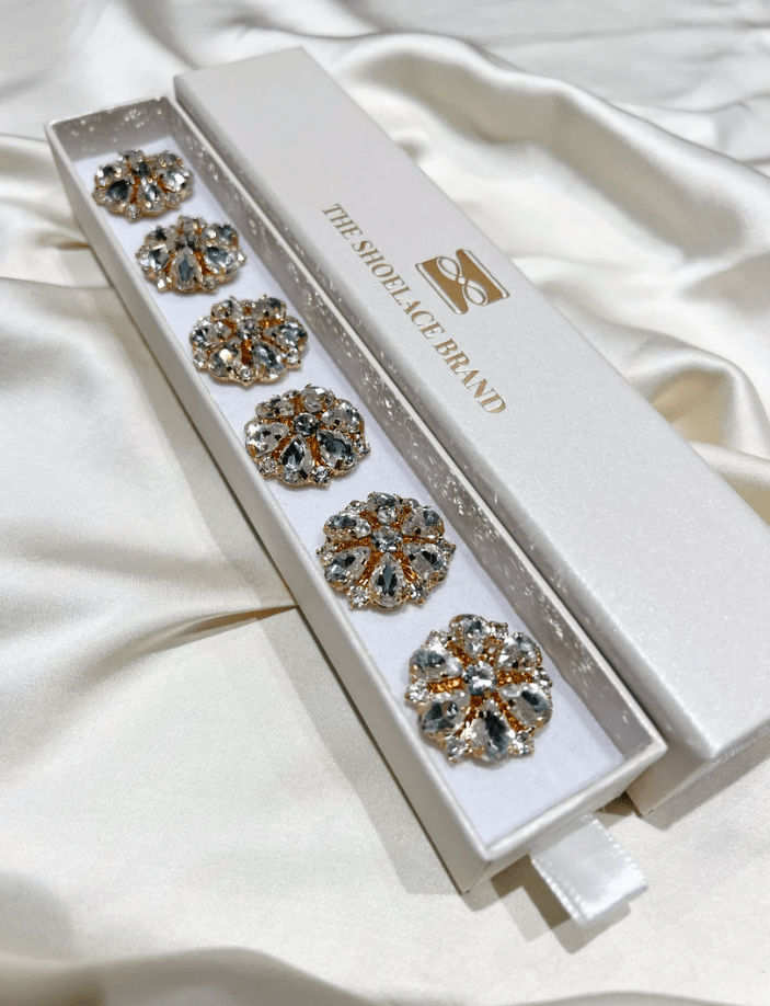 Signe är en blomformad knappberlock med sex droppformade vita stenar som kronblad, små klara stenar emellan och en skimrande mitt. Den gyllene basen ger varm elegans. Uppkallad efter både min dotter och svärmor – en hyllning till styrka och skönhet över generationer.