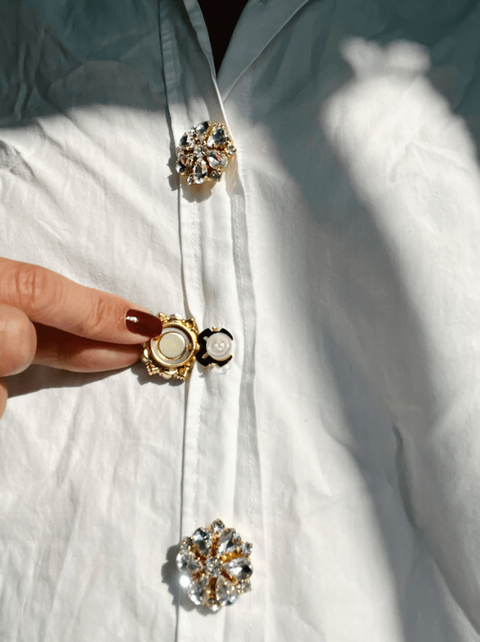 Bär knappsmycket på skjortor, koftor eller jackor. Lägg till en vid kragen som ett halsband, eller på ärmar som fuska manschettknappar.