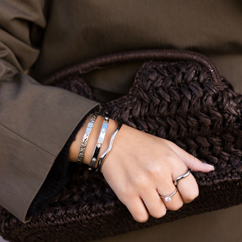 Låt handleden glimma som natthimlen! Det här stilrena, stela armbandet är prytt med gnistrande kristallstjärnor som fångar ljuset vid varje rörelse. Den fasta formen gör att armbandet sitter bekvämt och behåller sin eleganta silhuett hela dagen – perfekt både till vardags och fest.