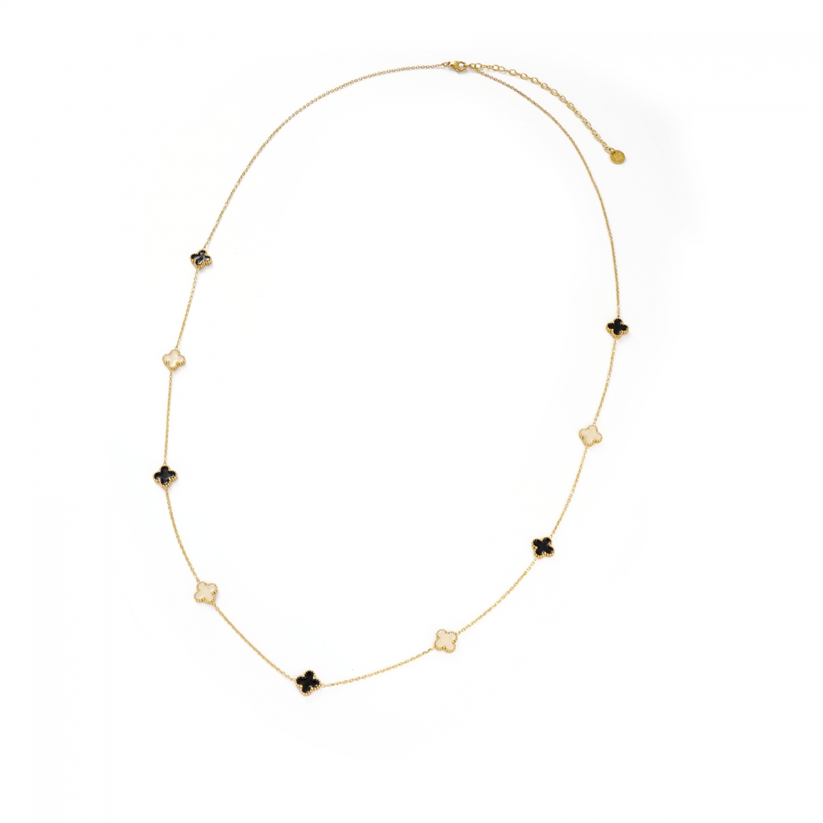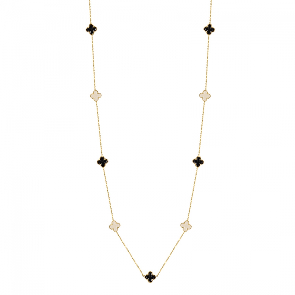 Clover Necklace är ett ett långt halsband som kombinerar symbolik och stil. De nio små fyrklöver-formerna med ivory och svart emalj ger halsbandet både ett lekfullt och stilfullt uttryck.