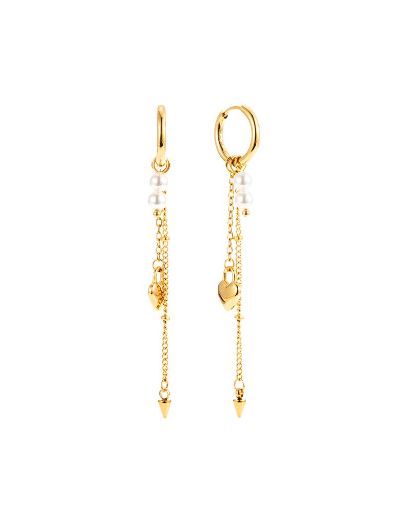 Eleganta örhängen där en tunn kedja pryds av ett hjärtformat hänge tillsammans med en liten dekorativ nit. Hjärtat ger en romantisk och feminin touch, medan niten tillför en modern, lite rebellisk känsla. Kombinationen skapar ett unikt smycke som passar lika bra till en enkel vardagslook som till en mer uppklädd stil.