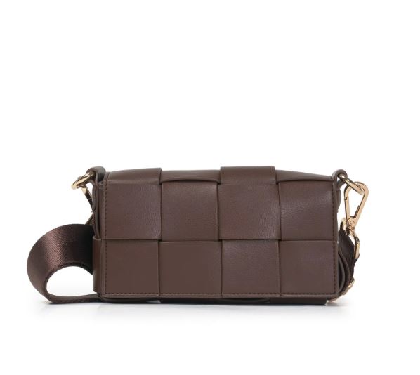 En elegant, mindre flätad axelväska som stängs med dolda magneter. Tre avtagbara axelremmar ingår, en justerbar bredare rem gjord i nylon. De andra två smalare banden är i samma material som väskan, där den ena används som axelrem och med det andra bandet kan väskan bäras som ett bälte. Designad med guldfärgade metalldetaljer och inuti väskan finns en avtagbar korthållare.