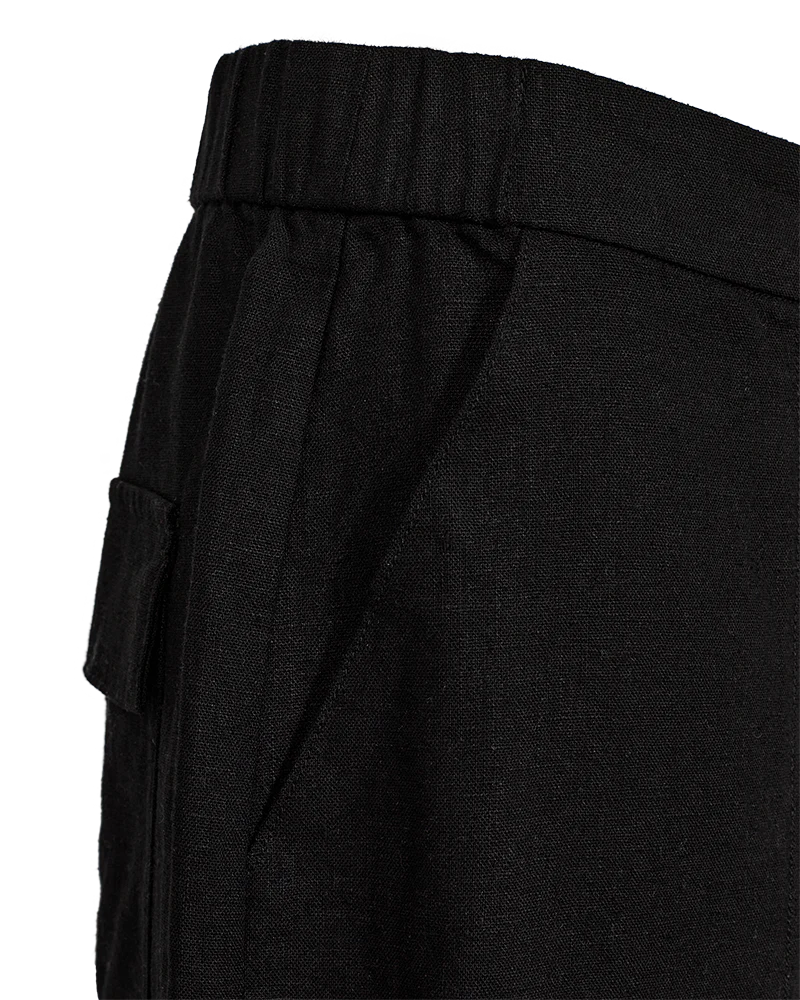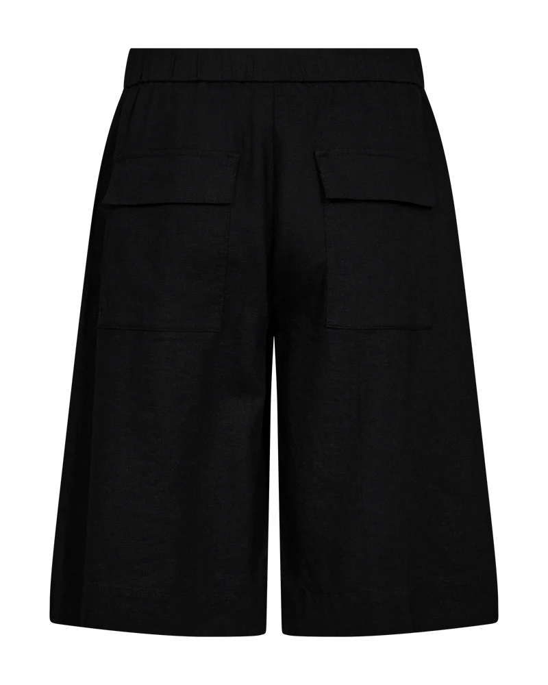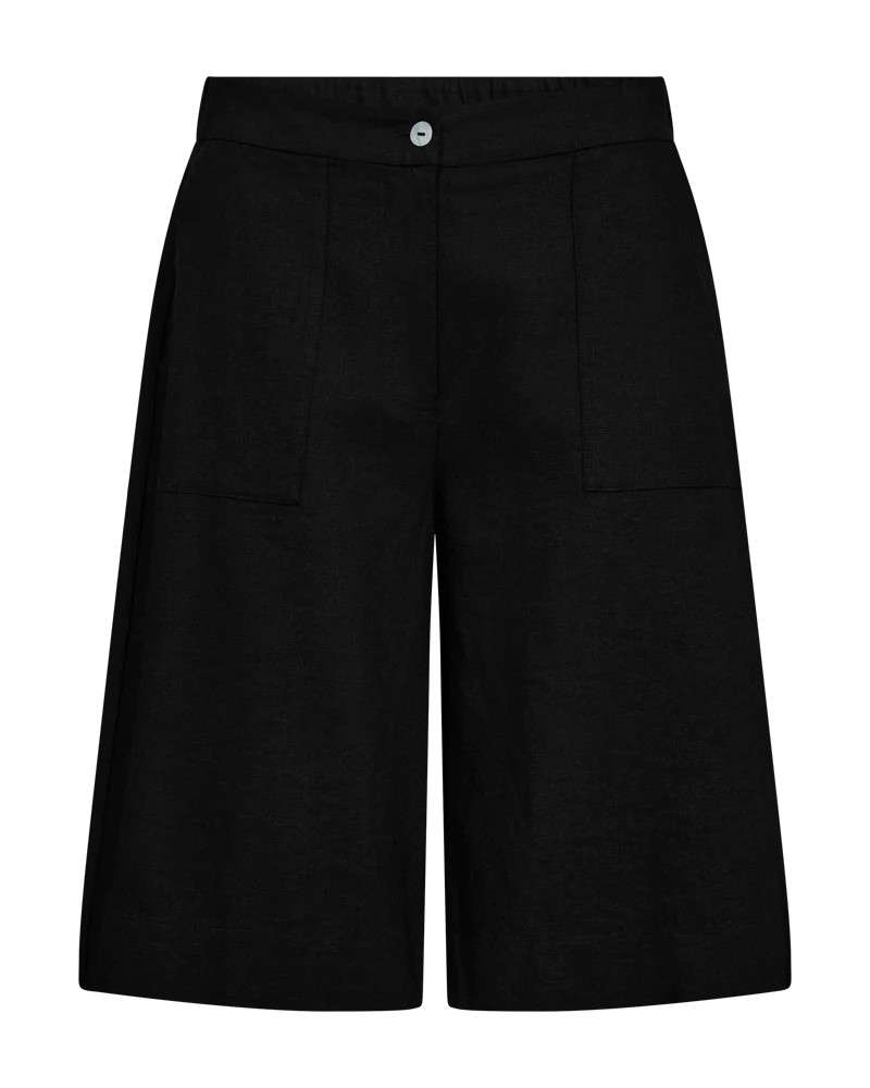 Shorts i linnematerial. Shortsen har en enkel silhuett med vida knälånga ben, fram- och bakfickor, praktiska detaljer, dragkedja och knappknäppning samt resår i midjan.