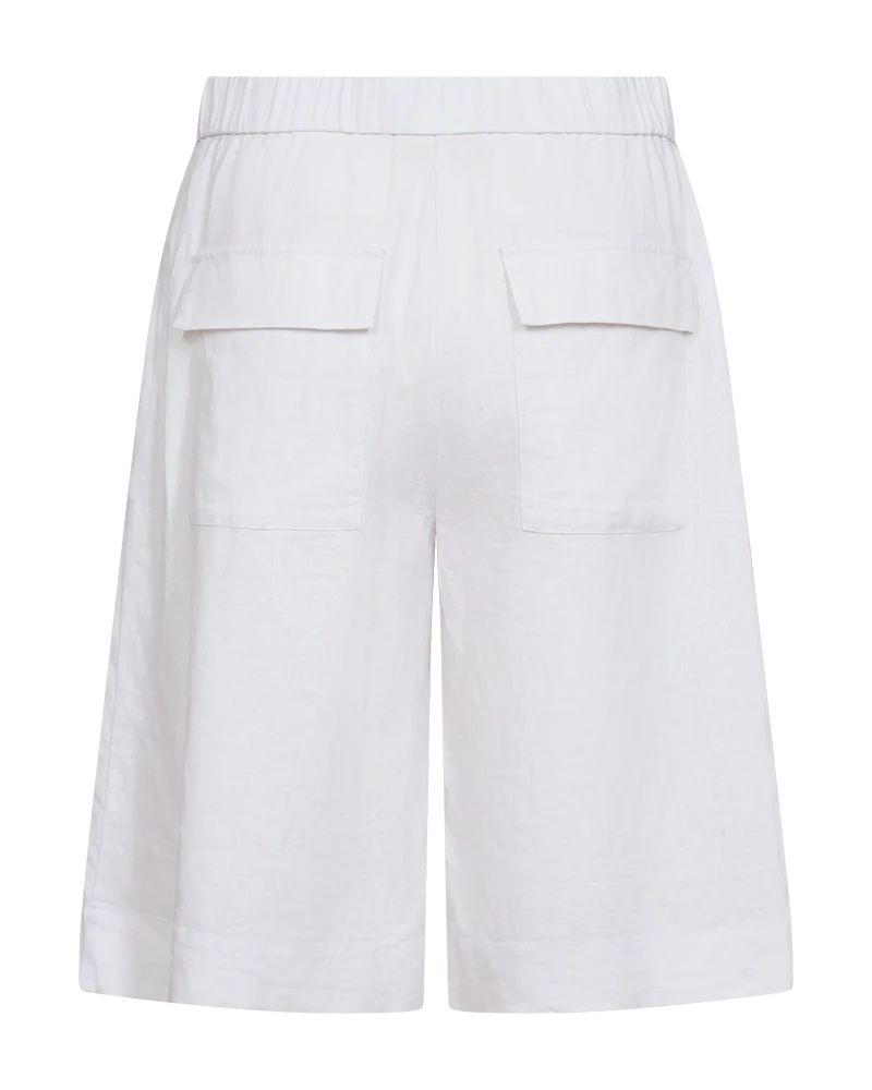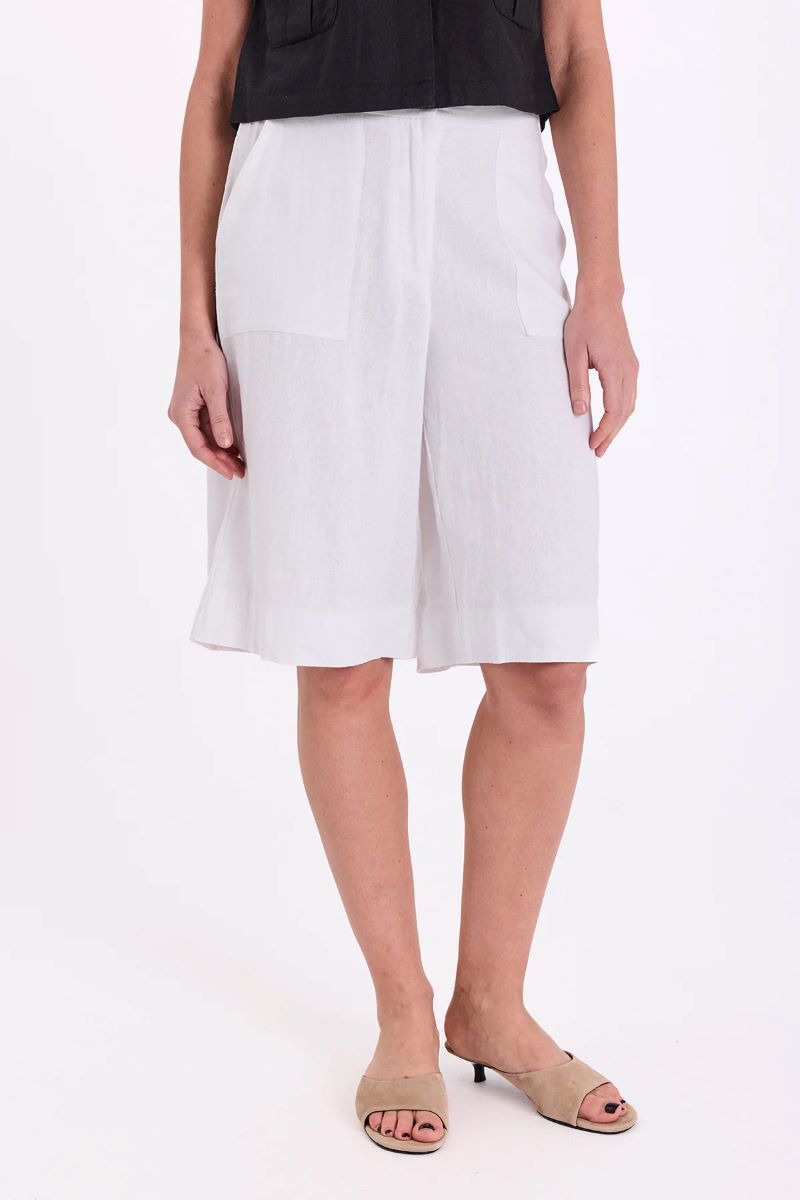 Shorts i linnematerial. Shortsen har en enkel silhuett med vida knälånga ben, fram- och bakfickor, praktiska detaljer, dragkedja och knappknäppning samt resår i midjan.