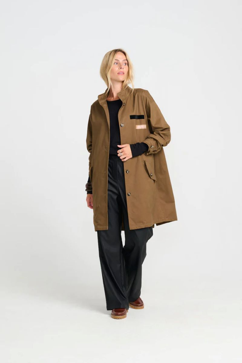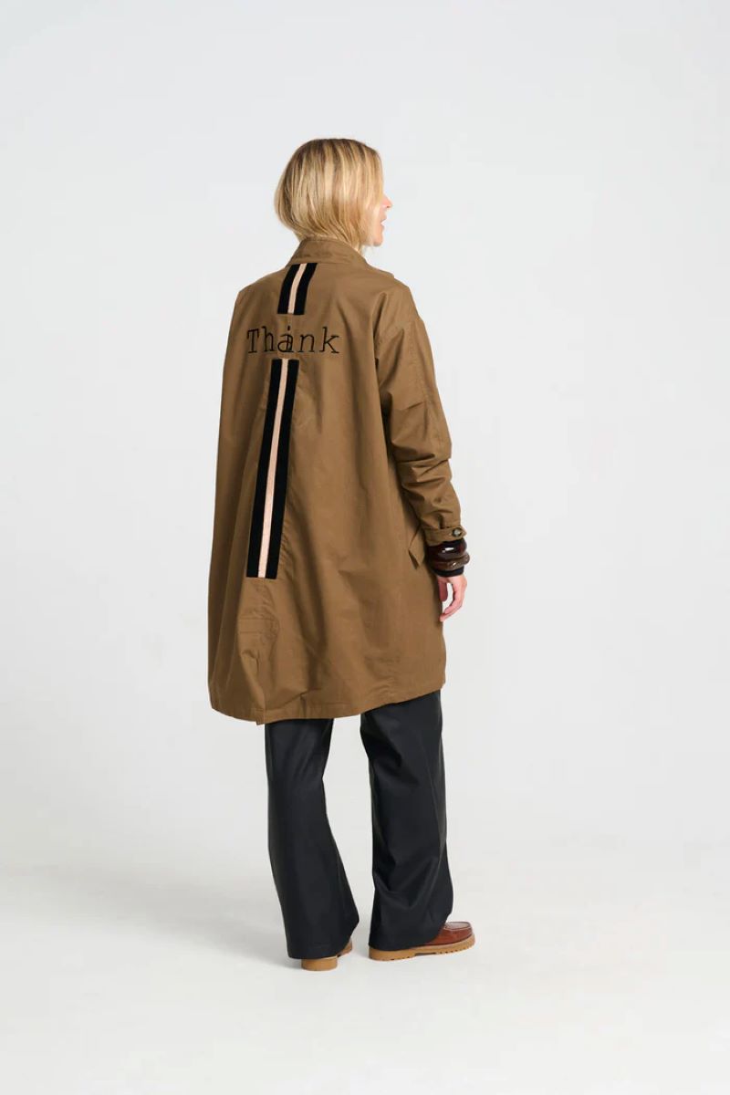 En superfin jacka, den här har texten ”Tack” på ryggen med ett ”i” inuti a:et. Så den kan även läsas som ”Tänk”. En supercool jacka i en brunaktig nyans.