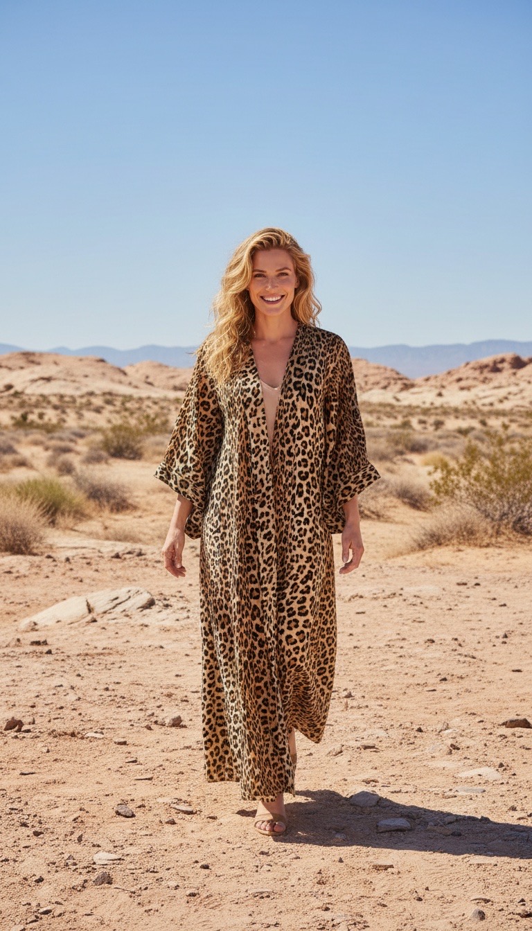 Kimono i ett tidlöst leopardmönster som ger en avslappnad men stilfull känsla. Den har en ledig passform och vida ärmar som faller mjukt längs kroppen. Perfekt att bära över klänning, jeans eller badkläder – lika fin till vardags som på semestern.
