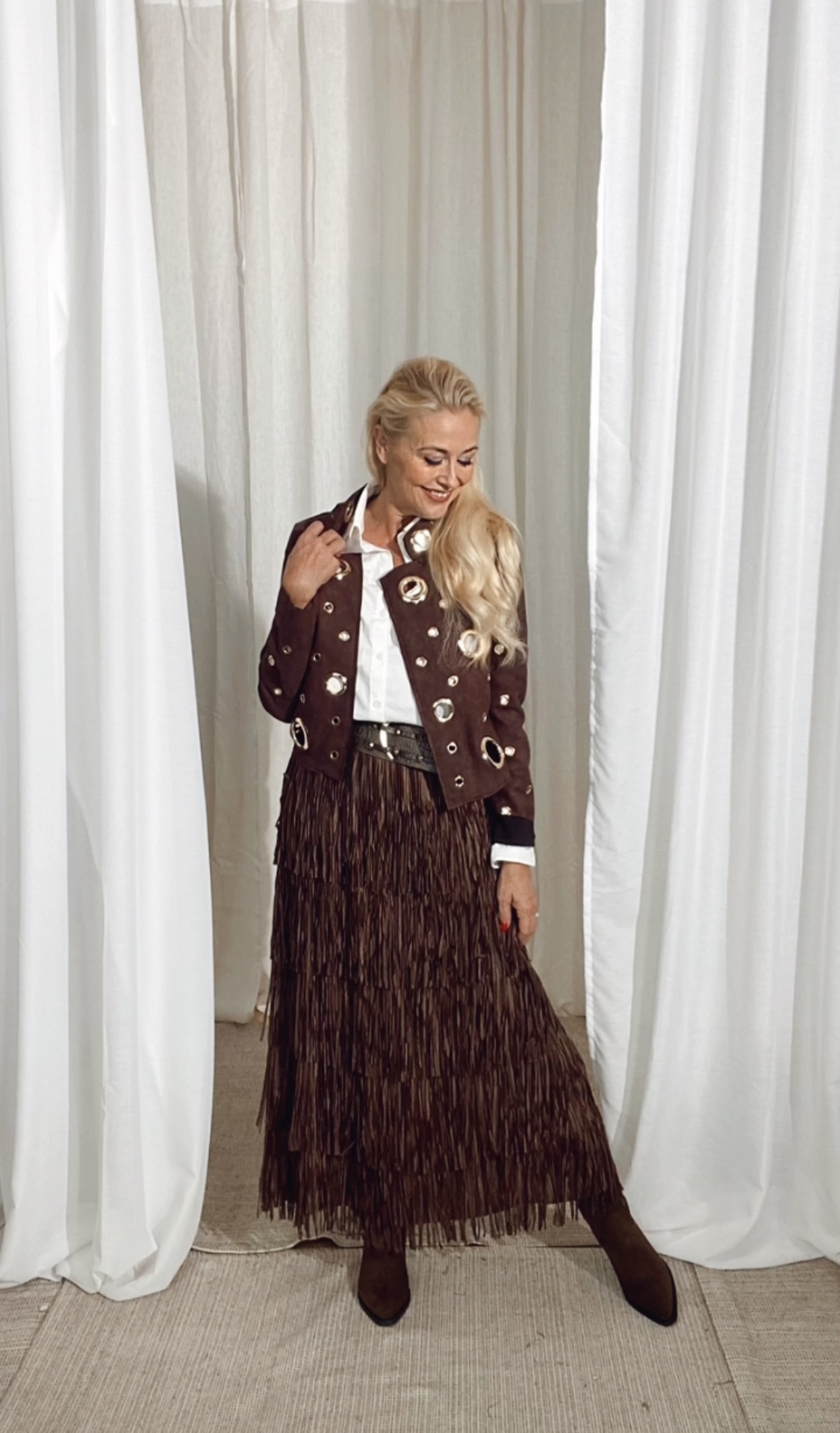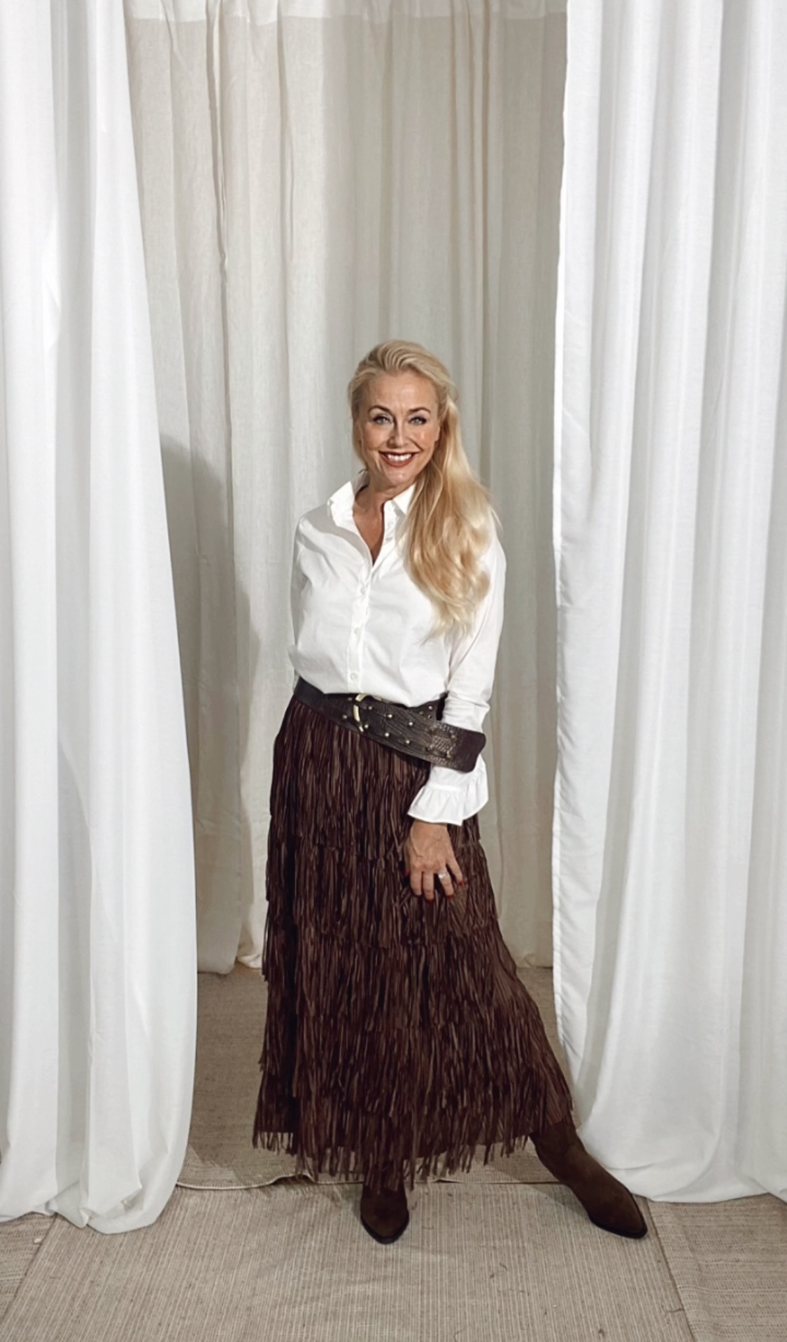 Den här lätta, pådragbara kjolen har en platt midjeband och kant, A-linje siluett. Skiktiga nivåer av fransar ger en rysning av rörelse vid varje steg. Vi älskar denna tillbaka till allt från stridsstövlar och tjocka tröjor till en slingbacks och en slinky topp.