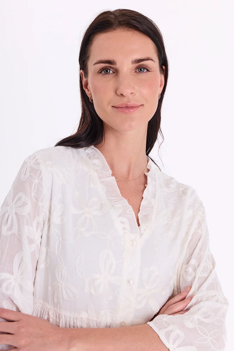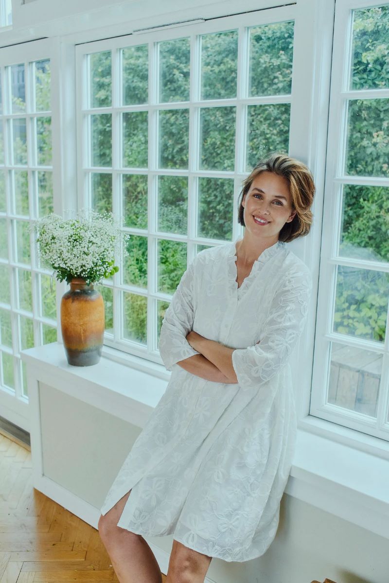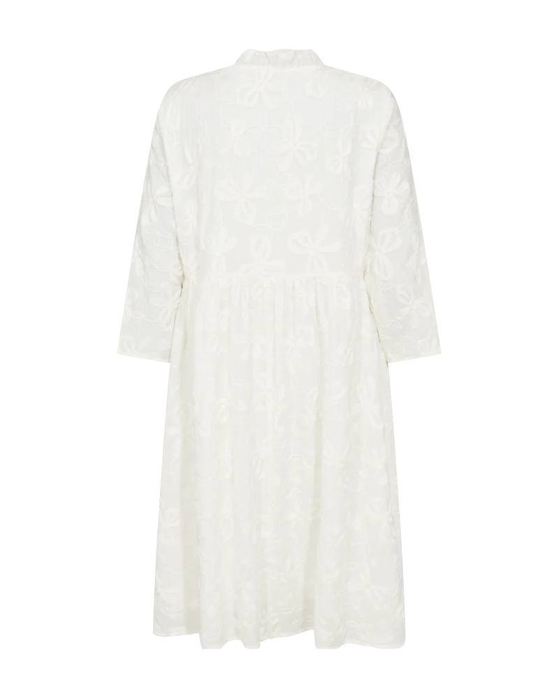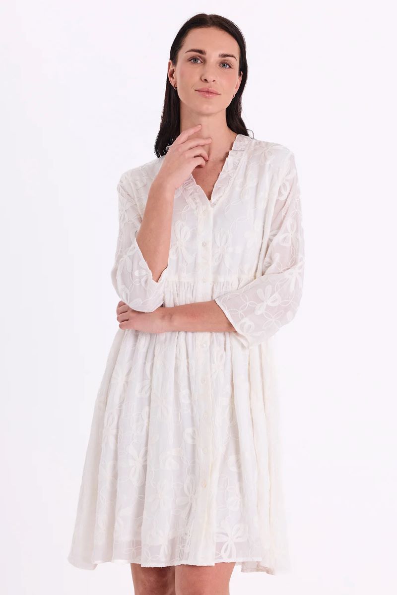 Klänning i ett lätt material med strukturerad broderi över hela klänningen. Klänningen har en enkel, voluminös silhuett med fickor i sidosömmarna. V-ringning med volangkant, knappslå fram och slumpmässiga rynkor under skuren linje. Enkla, raka trekvartslång ärm. Helfodrad vid kropp och kjol.