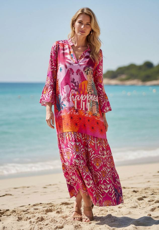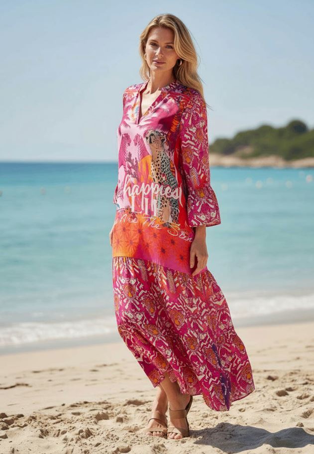 En feminin klänning med trekvarts trumpetärmar och stora, skiktade volanger för en böljande silhuett. Sidfickor ger bekvämlighet, medan V-ringningen med en liten ståkrage och mönstret i varma färger ger snygga accenter.