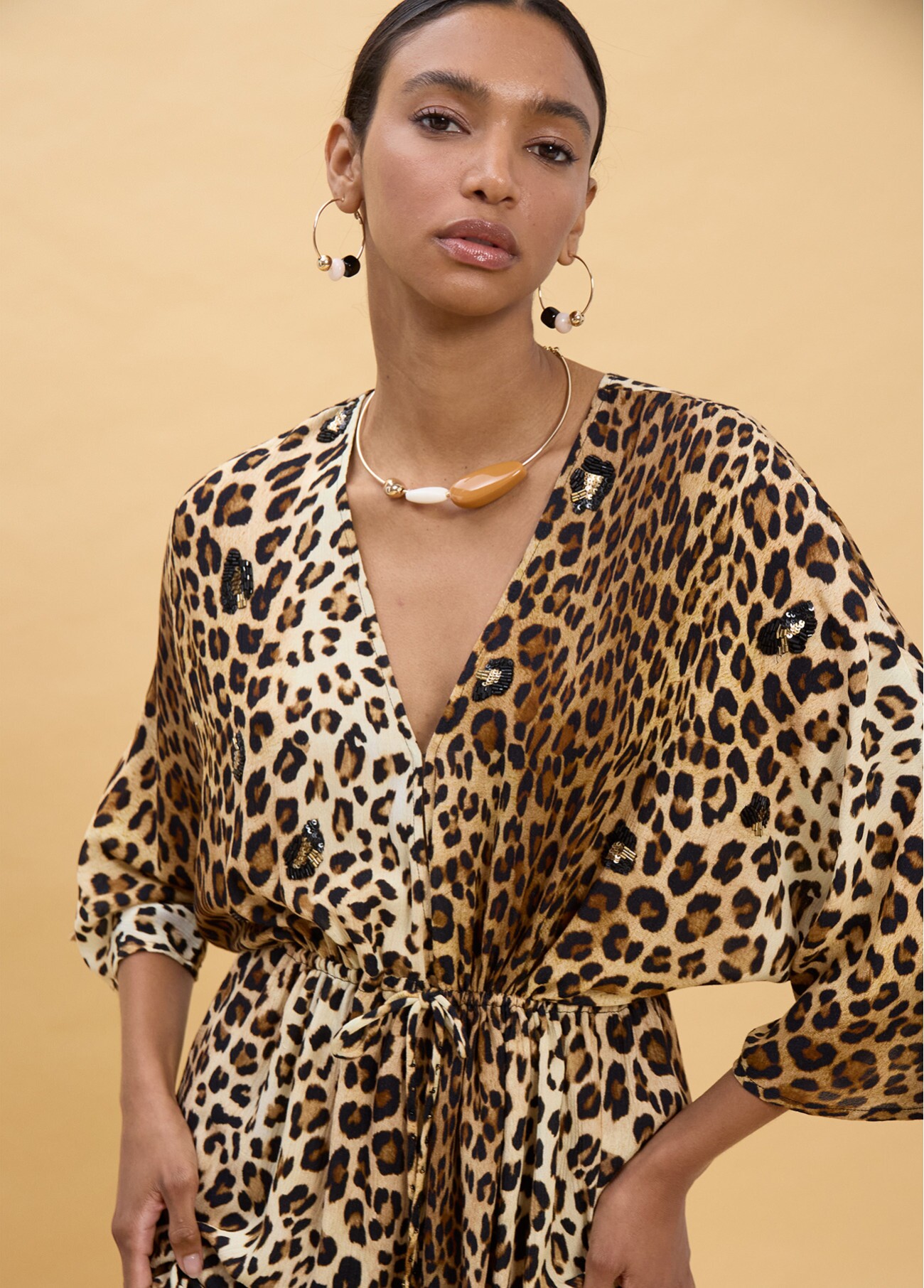 Lång, böljande silhuettklänning med djurtryck. Har vida ärmar och ett justerbart bälte för en elegant look. V-ringning och slits bak ger en djärv, modern touch.