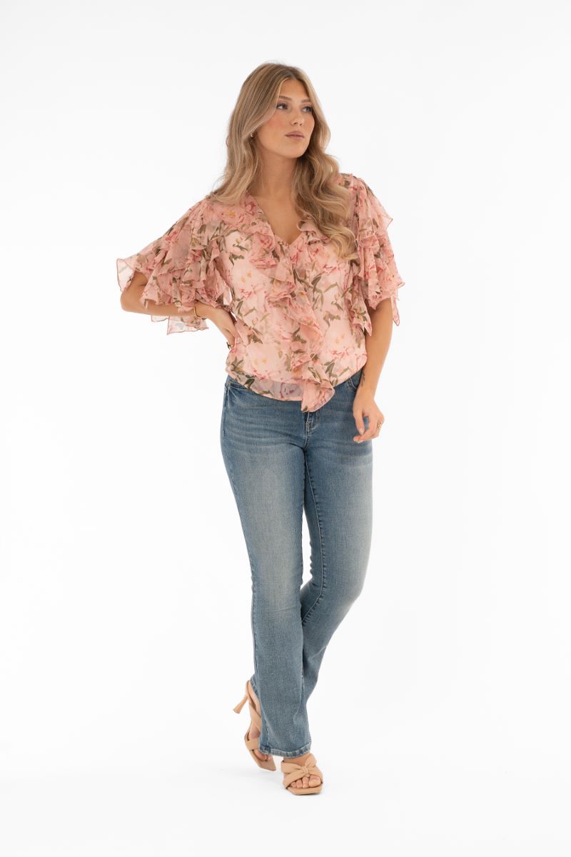 Denna v-ringade blus pryds av en söt volang som löper längs hela halsringningen och fortsätter ner mot nederkanten för en feminin och lekfull detalj. Ärmarna är vida och sydda i kilar med volanger längs sömmarna, vilket ger ett livfullt och elegant uttryck. Blusen har en ledig passform och är helfodrad i kroppen för extra komfort och ett mjukt fall. En feminin och trendig blus som passar perfekt till både vardag och fest, och kan stylas med kjol, byxor eller jeans.