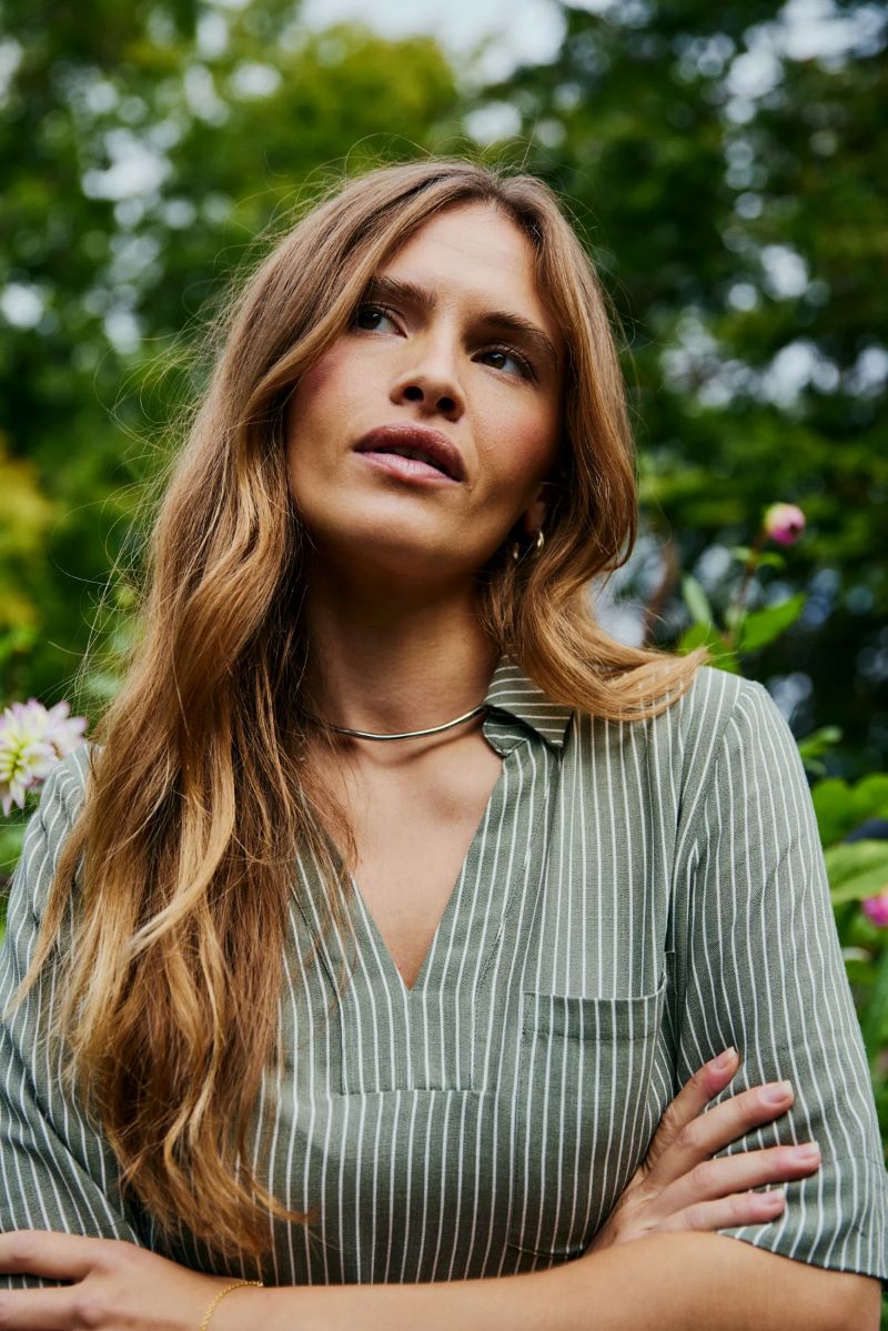 Blus i ett mjukt material. Blusen har en enkel silhuett med lös passform, v-ringning, vikt krage, halvärmar och en bröstficka.