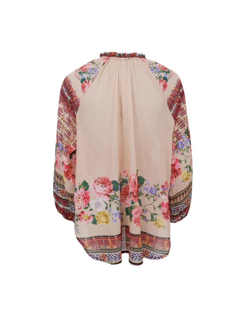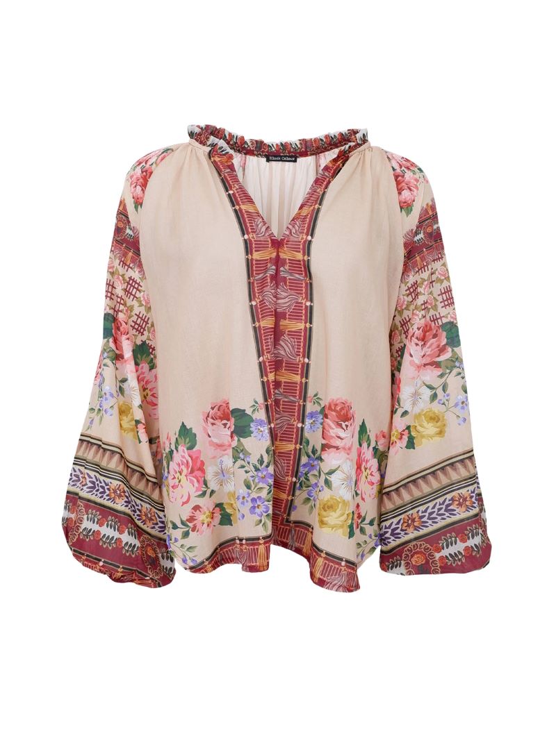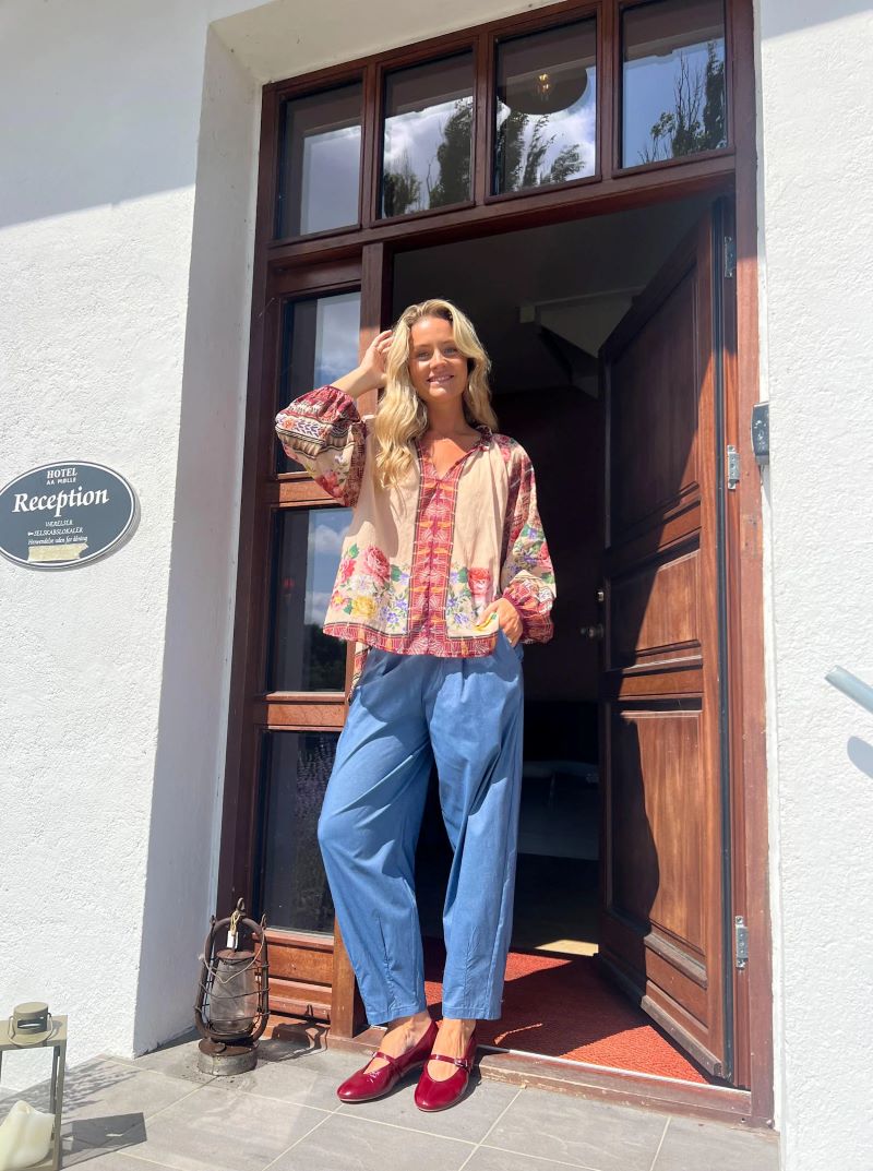 Skapa ett blickfång med den iögonfallande Dahlia-blusen, där varma färger och dekorativa mönster smälter samman till ett harmoniskt och konstnärligt uttryck. De vida ärmarna och den lösa passformen fulländar den avslappnade bohemiska looken. En idealisk blus för dig som älskar färger och personlighet i sin garderob.