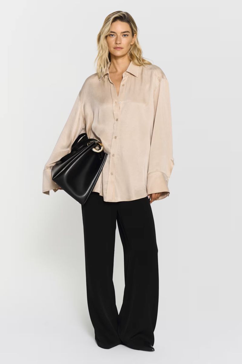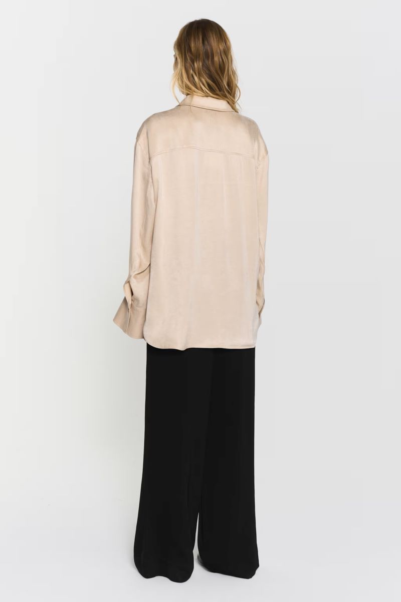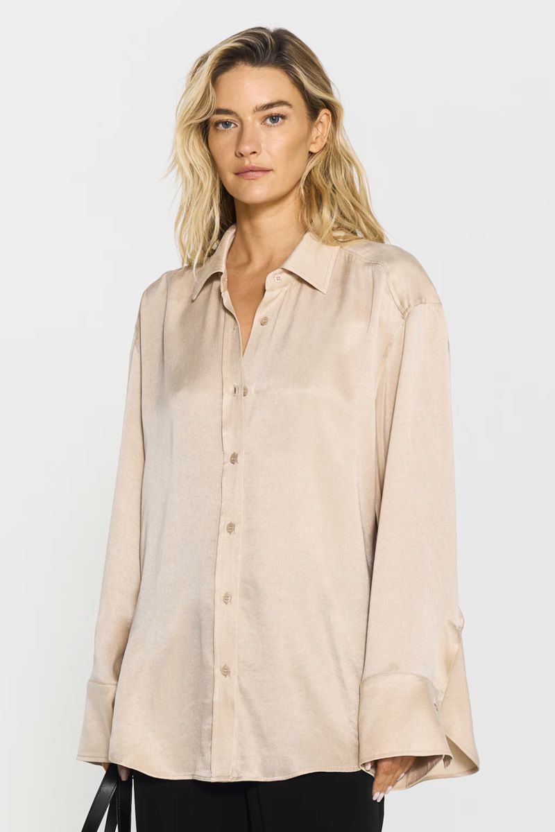 Alivia-skjortan är tillverkad av lyxig lyocell för en böljande känsla, en överdimensionerad passform och justerbara manschetter, vilket kombinerar komfort med avslappnad stil.