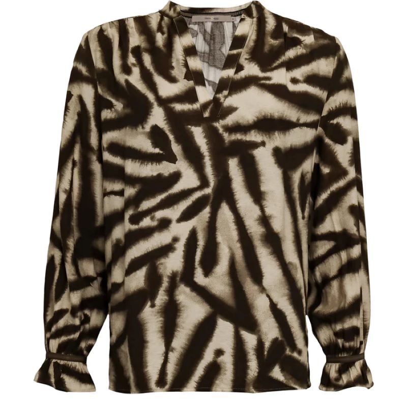 En superfin blus med liten v-ringning. Den har även en liten rynkning vid axeln vilket ger lite uttryck. Den har även ett litet resårband vid ärmöppningen.