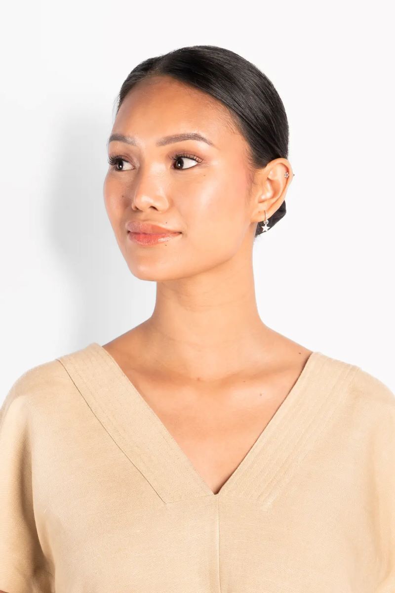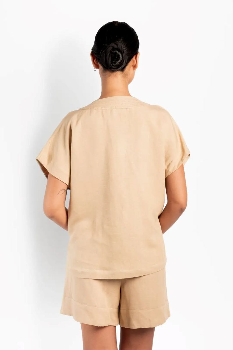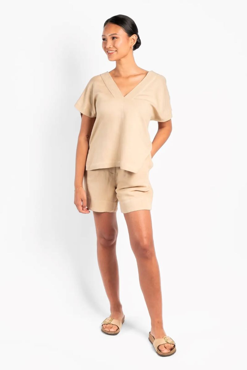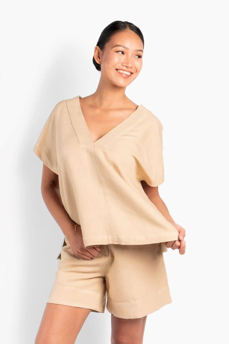 Simone-toppen är designad med en ren, avslappnad silhuett och ett mjukt, naturligt fall. Tillverkad av en andningsbar linne- och viskosblandning, ger den en lätt känsla och bekväm rörelse. Med V-ringning och korta ärmar för en enkel, luftig look. Ett mångsidigt plagg som enkelt passar till både denim och mer eleganta stilar.
