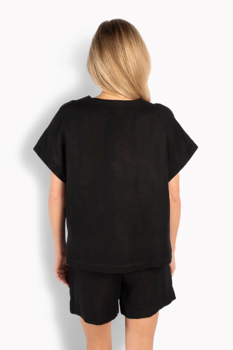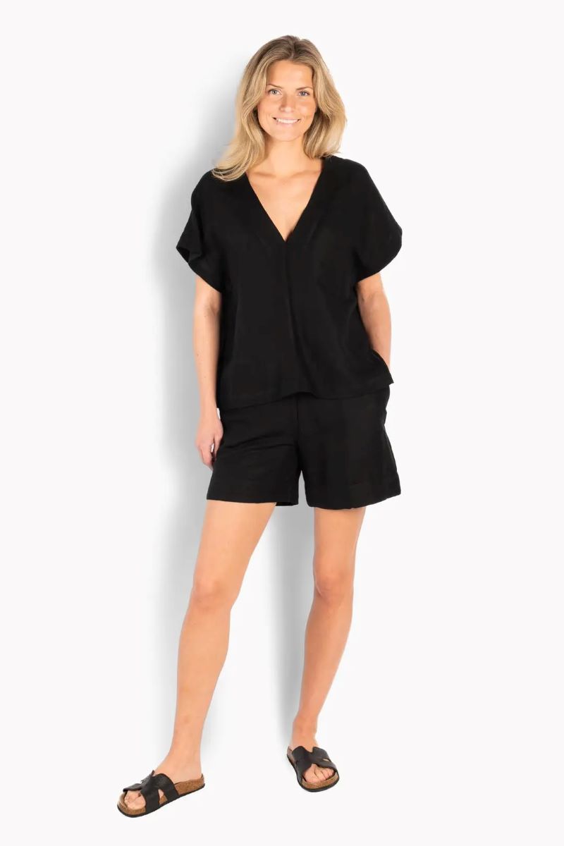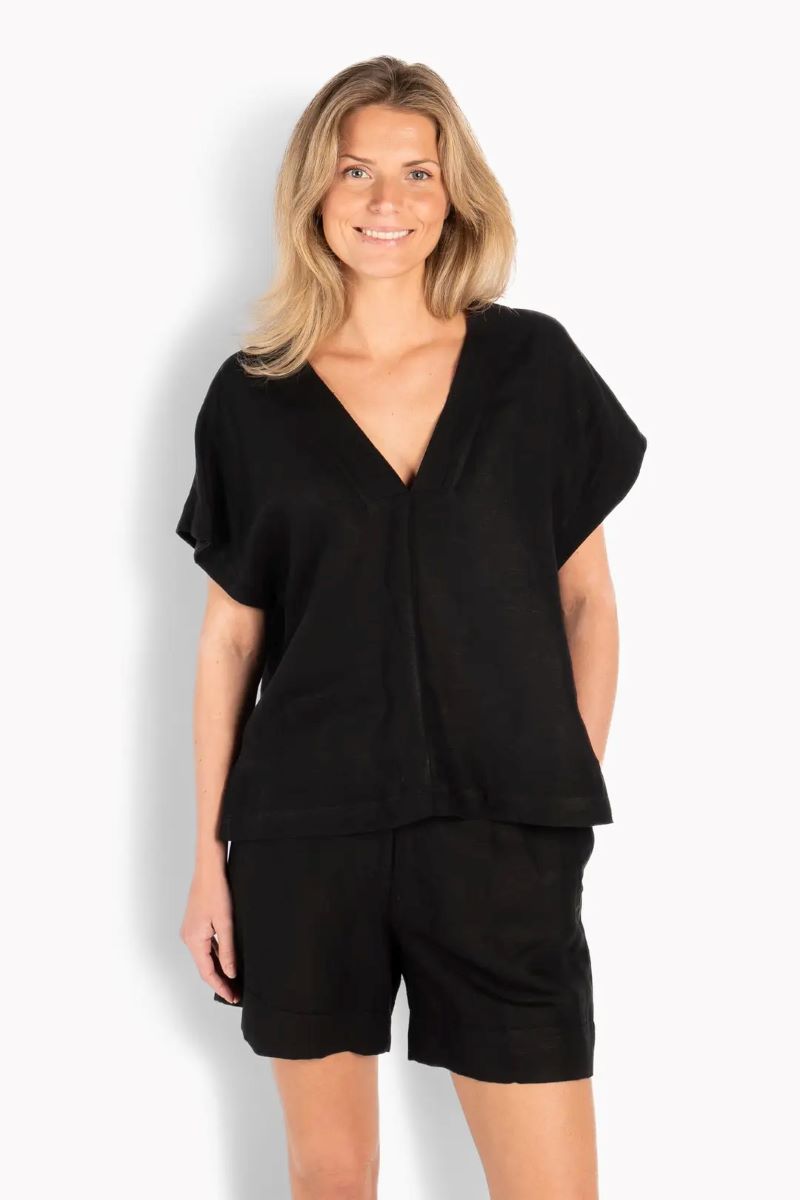 Simone-toppen är designad med en ren, avslappnad silhuett och ett mjukt, naturligt fall. Tillverkad av en andningsbar linne- och viskosblandning, ger den en lätt känsla och bekväm rörelse. Med V-ringning och korta ärmar för en enkel, luftig look. Ett mångsidigt plagg som enkelt passar till både denim och mer eleganta stilar.