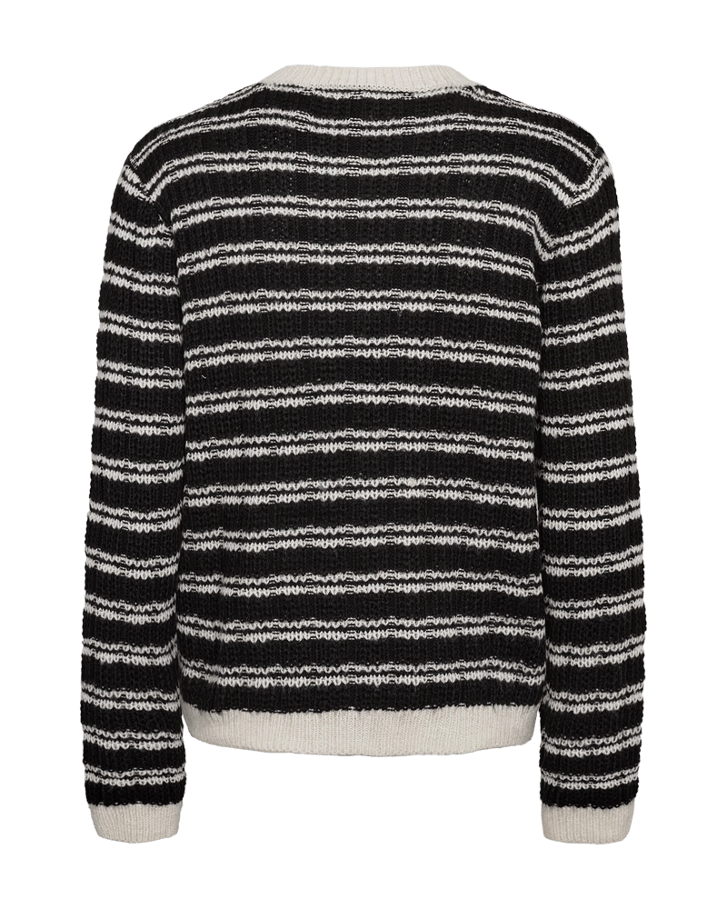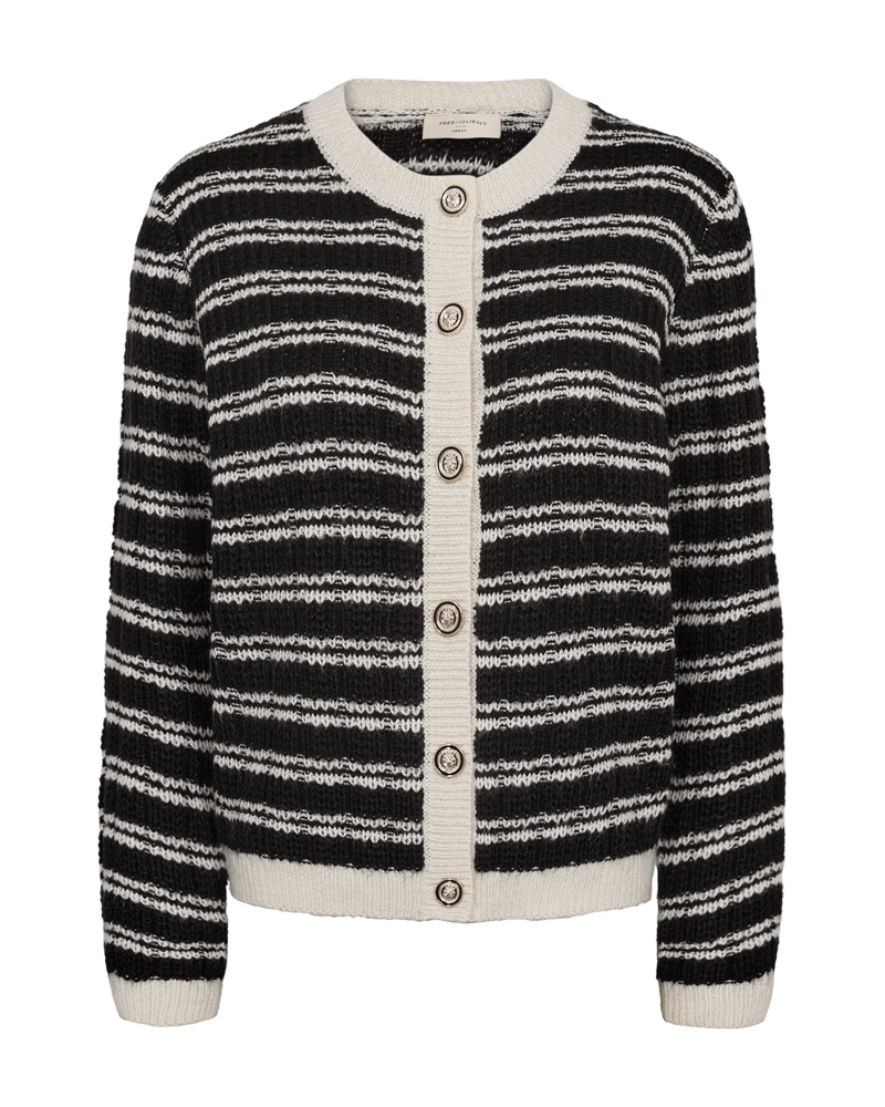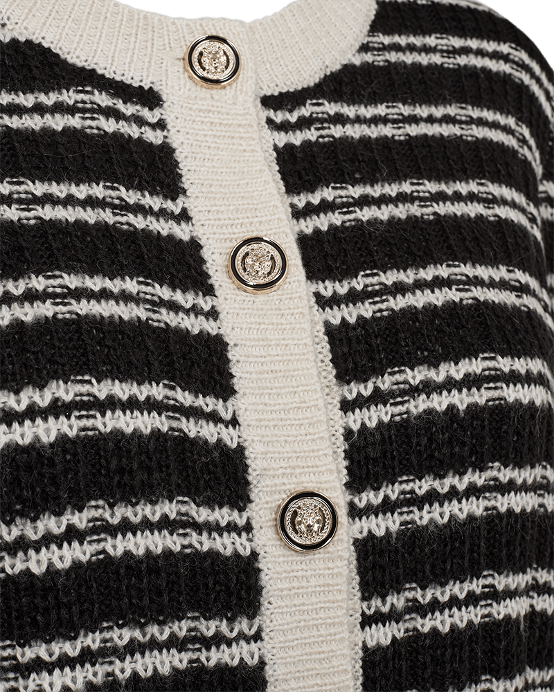 Kofta i ett mjukt, stickat material med ränder och ribbad struktur. Koftan är inspirerad av Chanel med dekorerade knappar framtill, ribbstickning och en elegant, avslappnad passform.