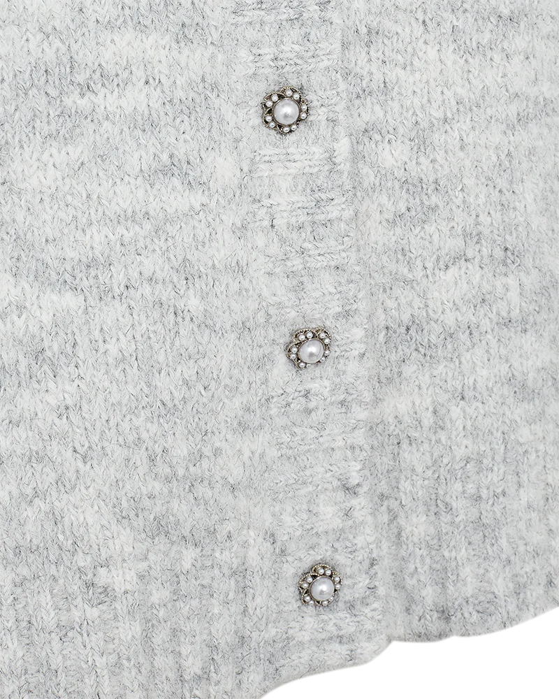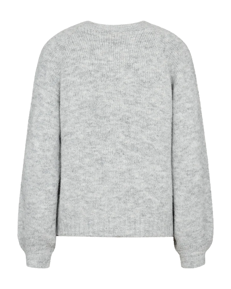 Kofta i ett mjukt, stickat material. Koftan har en enkel silhuett med långa ballongärmar, rundad halsringning, ribbstickning och vackra knappar fram som ger ett elegant utseende.