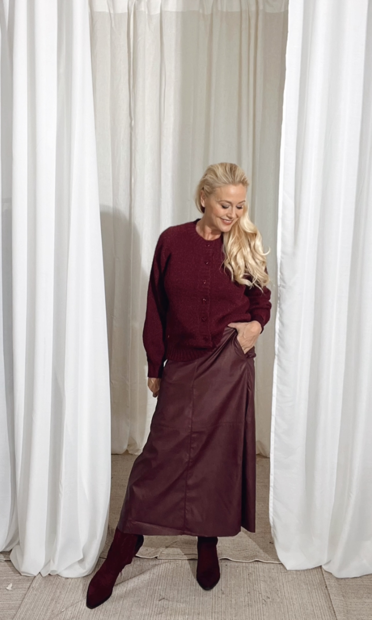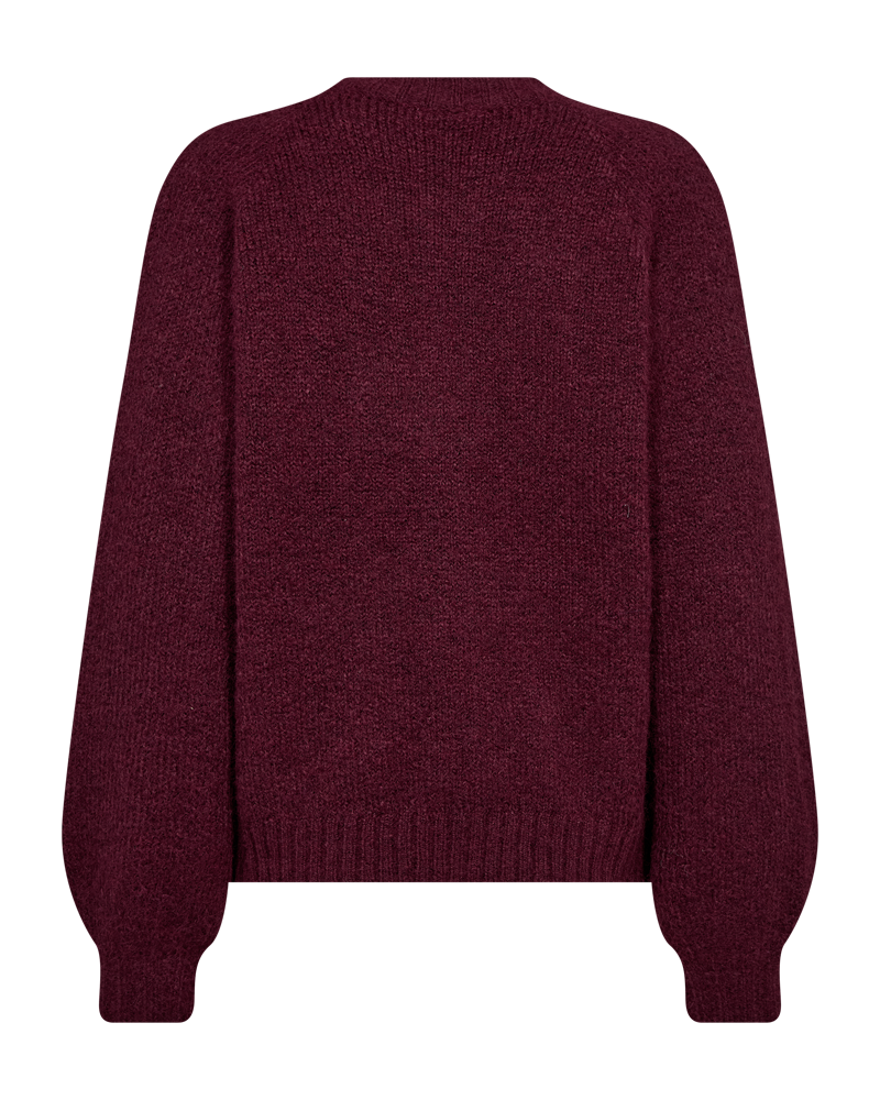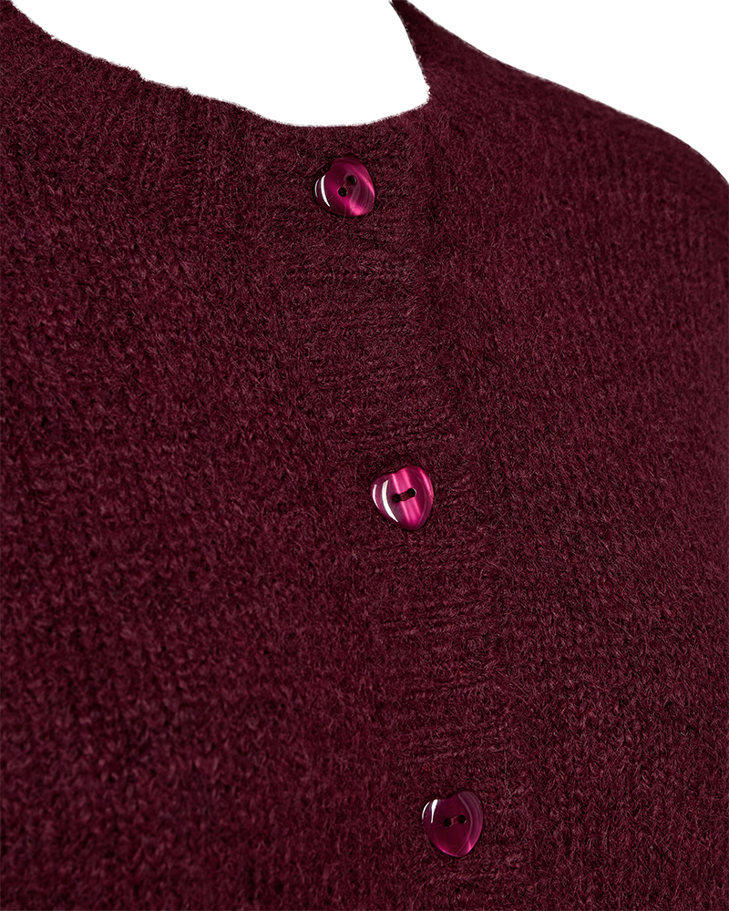 Kofta i ett mjukt, stickat material. Koftan har en enkel silhuett med långa ballongärmar, ribbstickning, en lös passform och hjärtformade knappar framtill.