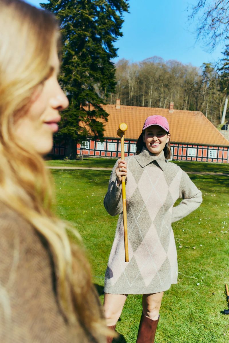 Tunika i ett finstickat material med argylemönster. Tunikan har en enkel silhuett med lös passform, långa ärmar och hög krage.