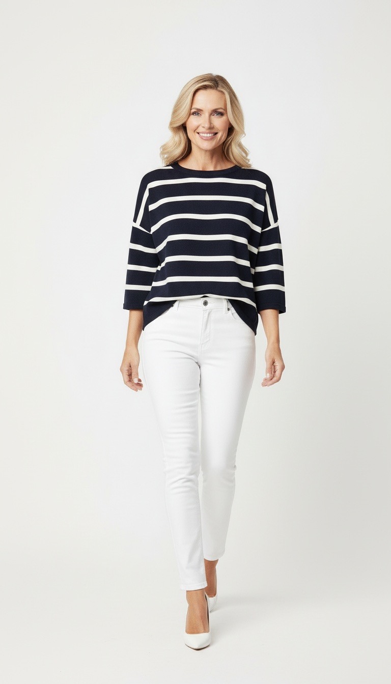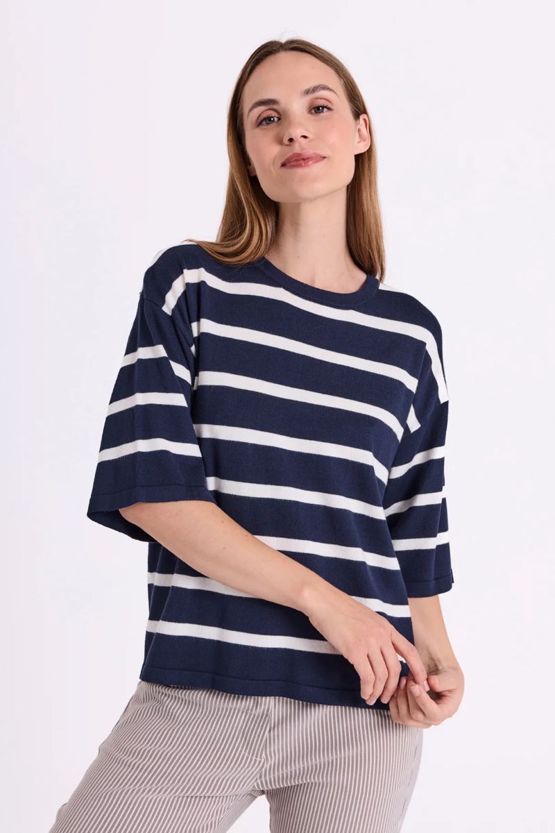 T-shirt i ett mjukt material med randigt mönster. Tröjan har en enkel silhuett med rundad halsringning, ribbstickning och korta, vida ärmar med nedsänkta axlar som framhäver den lösa passformen.