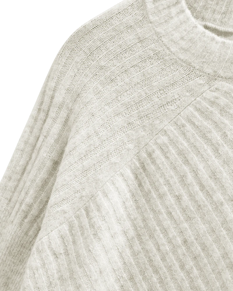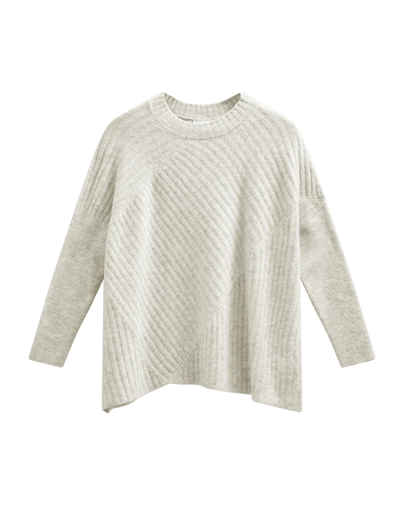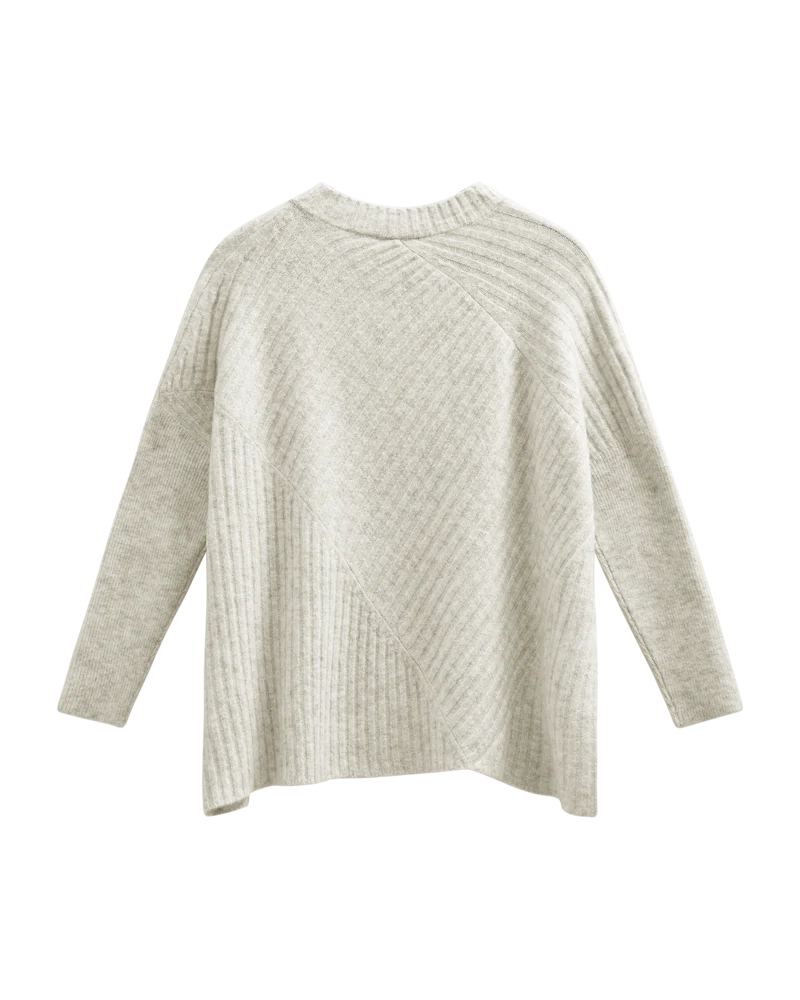 Tröja i ett ribbat material med asymmetrisk skärning. Tröjan har en enkel silhuett med smala, långa ärmar, ribbad krage och en elegant, lös passform.