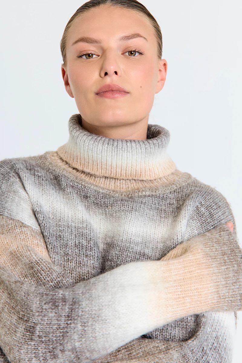 Tröja i ett mjukt, stickat material. Tröjan har en enkel silhuett med polotröja, ribbstickad mudd och långa ärmar med nedsänkta axlar som framhäver den lösa passformen.