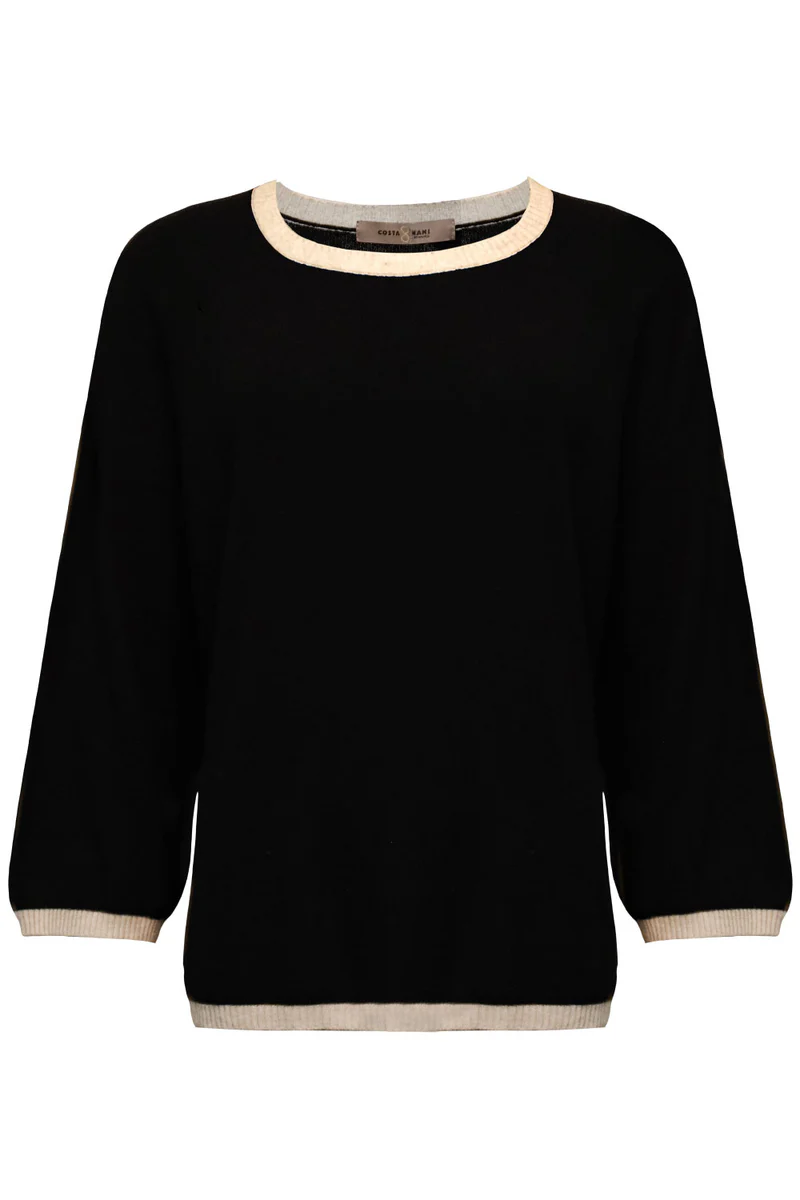 Mjuk stickad tröja i en bekväm kvalitet med rund halsringning och trekvartsärmar. Designad med kontrasterande kanter vid halsringning, ärmar och nederkant, vilket ger en fräsch och modern look. En avslappnad och snygg tröja, perfekt för både vardag och arbete.