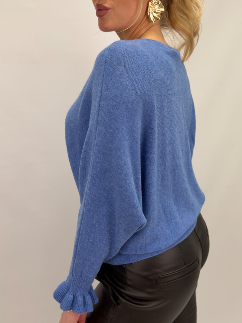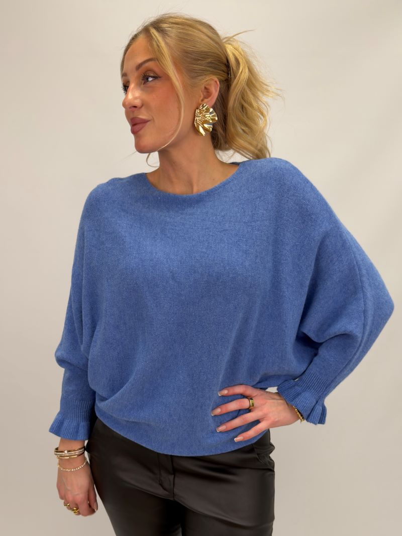 Nanna är en mjuk stickad tröja med avslappnad passform och fina rynkade ärmslut som ger en elegant twist. Den rundade halsringningen och det lediga snittet gör den till en självklar favorit för både vardag och mysiga stunder.