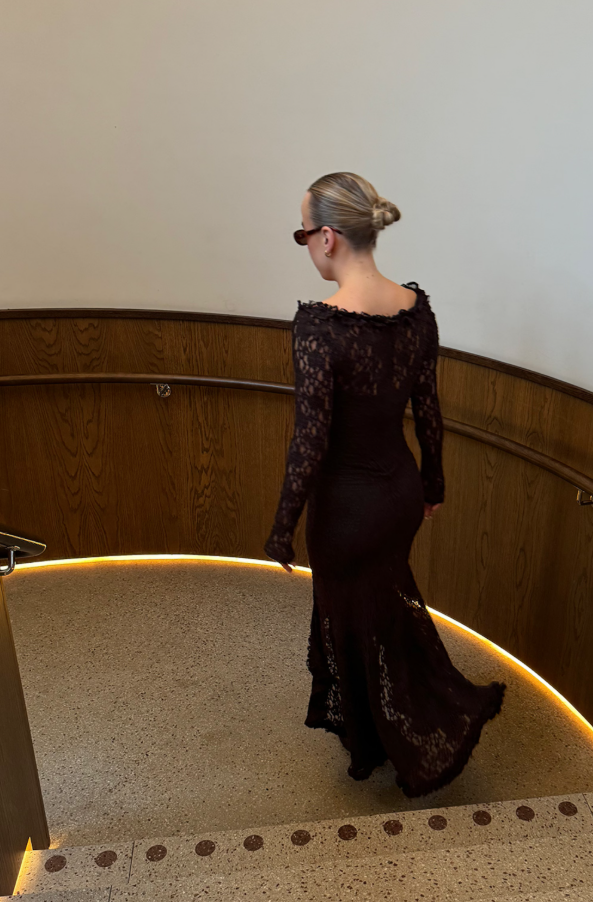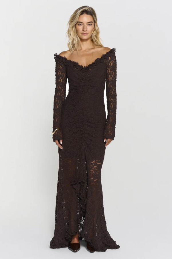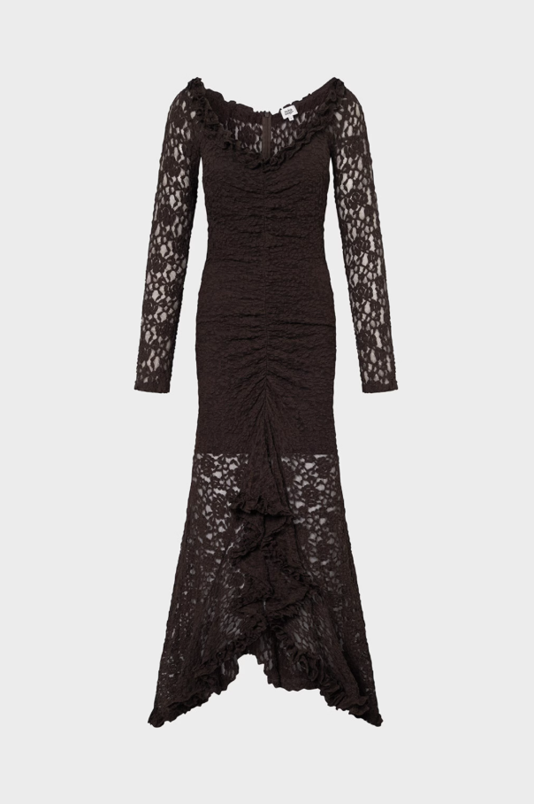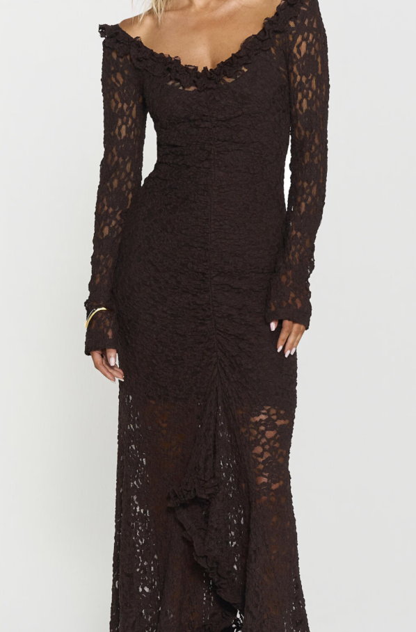 Ashley Lace-klänningen har invecklad spets, en V-ringning med volangdetaljer och elegant rynkad framtill. Den har en bekväm underklänning, en dold dragkedja bak, full längd bak och en slående lång slits fram för en sofistikerad men ändå lockande look.