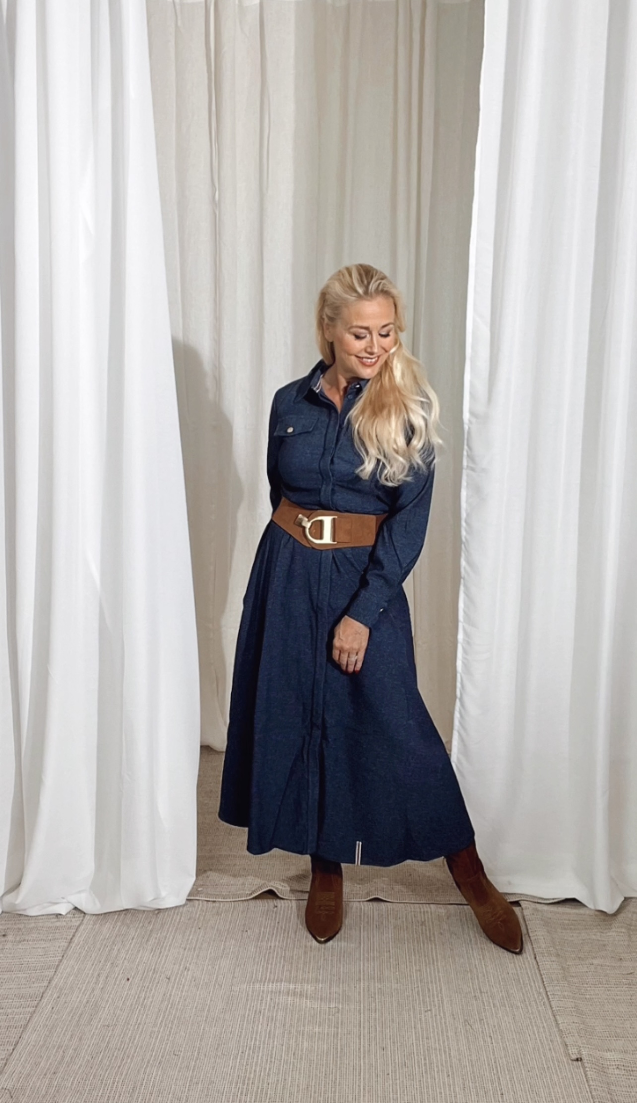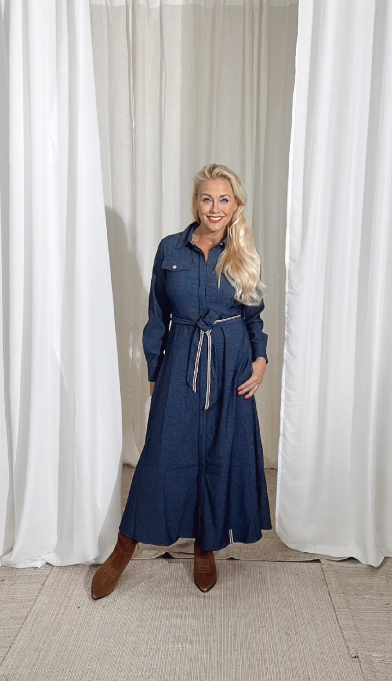 En riktigt fin klänning med klassisk passform. I stretchigt jeansliknande material med fina detaljer. Knappar hela vägen fram och en tyngd i klänning som är exklusiv.