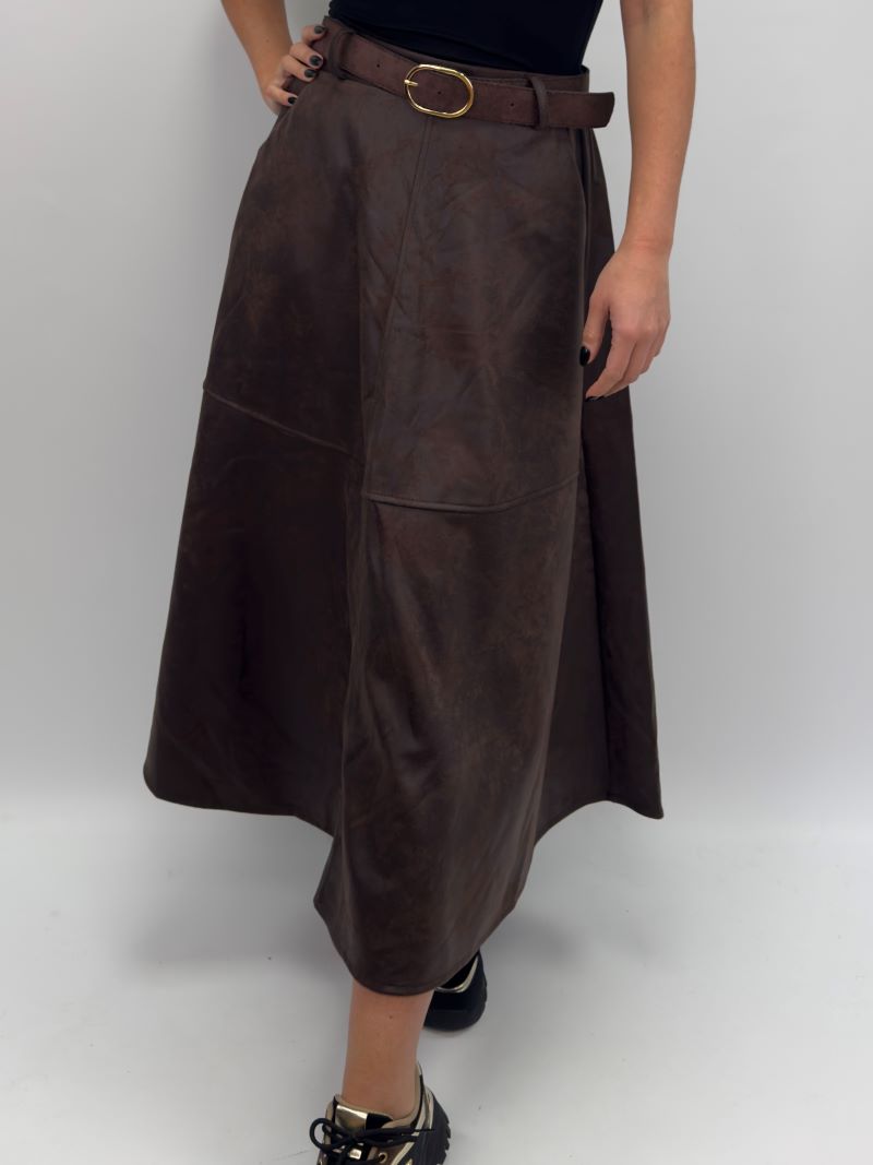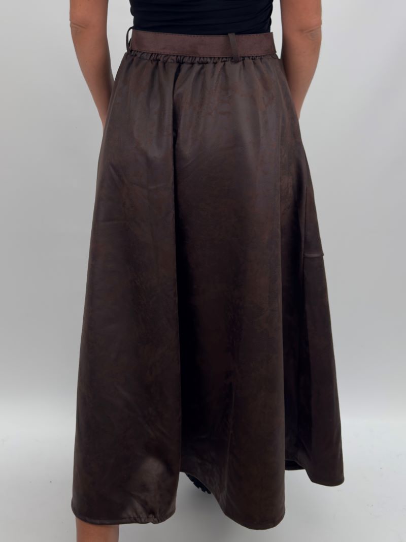 Katja är en elegant A-linjeformad kjol i mjukt konstläder med en sammetslen finish. Den höga midjan och det eleganta utsvängda snittet skapar en smickrande silhuett – lätt att styla för vardagsbruk eller uppklädd för festliga tillfällen.
