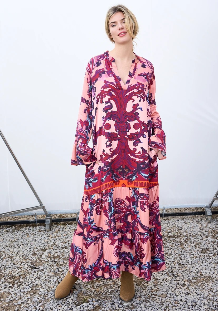 Snygg maxiklänning med trumpetärmar, och V-ringning med liten ståkrage. Sidfickor ger klänningen en avslappnad men elegant look.
