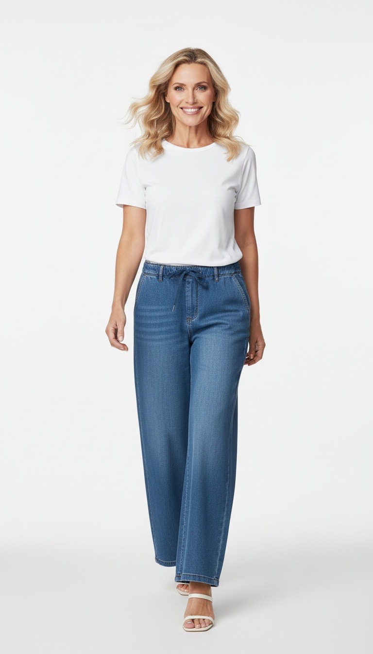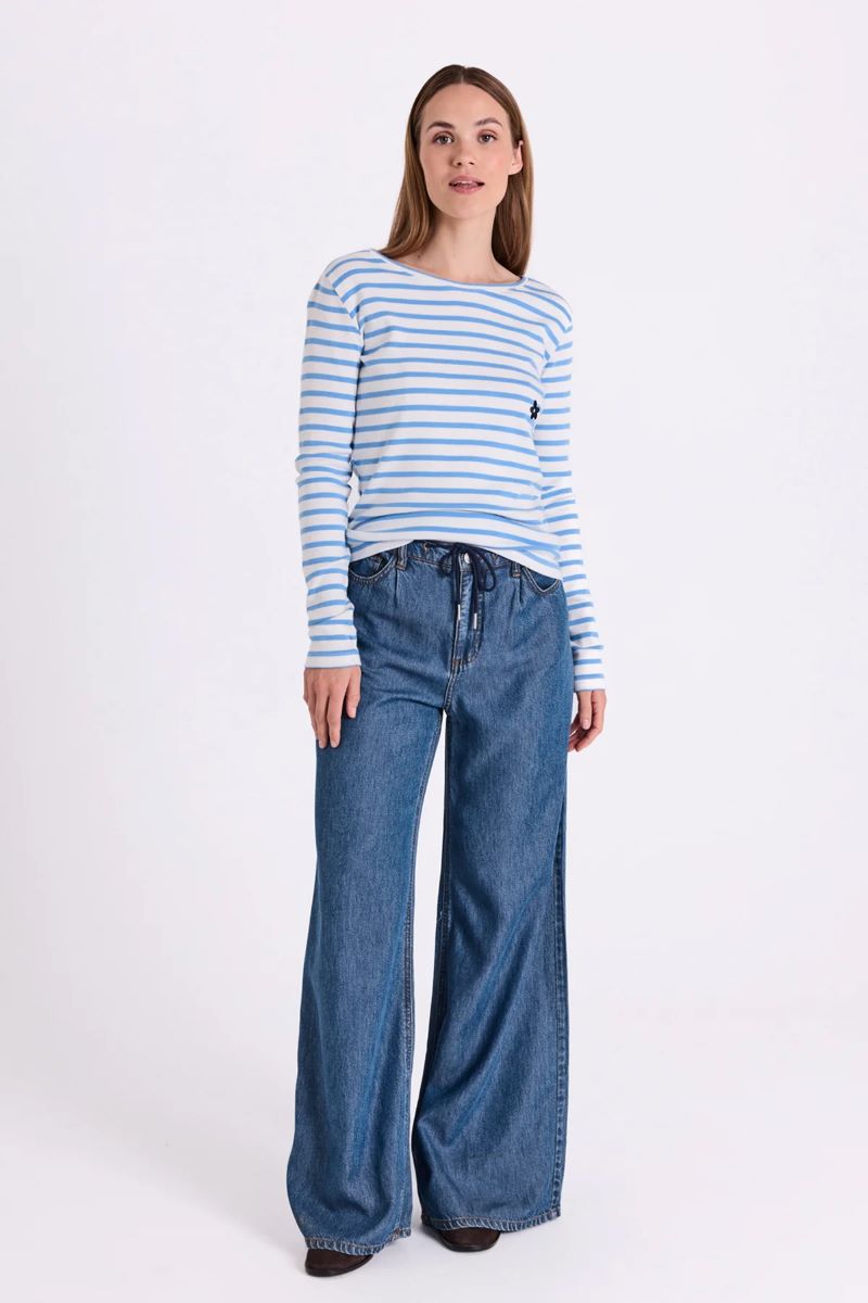 Byxor i ett lätt denimmaterial. Byxorna har en enkel silhuett med resår i midjan och dragsko, raka, vida ben samt fickor fram och bak.