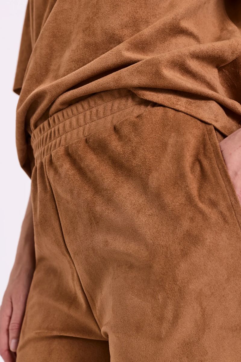 Byxor från Freequent i ett mjukt och lyxigt mockaimitationsmaterial som ger en elegant look och en bekväm känsla. Byxorna har en enkel silhuett med resår i midjan, långa, vida ben, sidfickor och sömdetaljer på knäna.