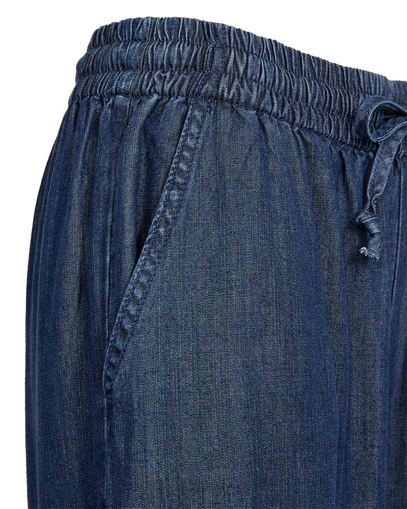 Byxor från Freequent i ett lätt denimmaterial. Byxorna har en enkel silhuett med resår i midjan och dragsko, raka, vida ben, sidfickor och passpoaldetaljer.