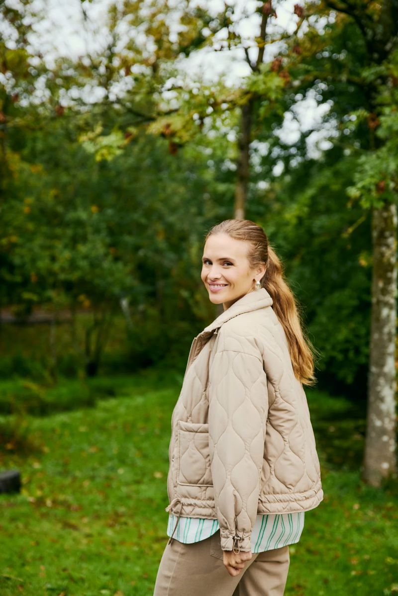 Vaddjacka i ett mjukt material med elegant mönster. Jackan har en enkel siluett med långa ärmar, dragkedja och tryckknapp, fickor fram, avslappnad passform och dragsko i nederkant