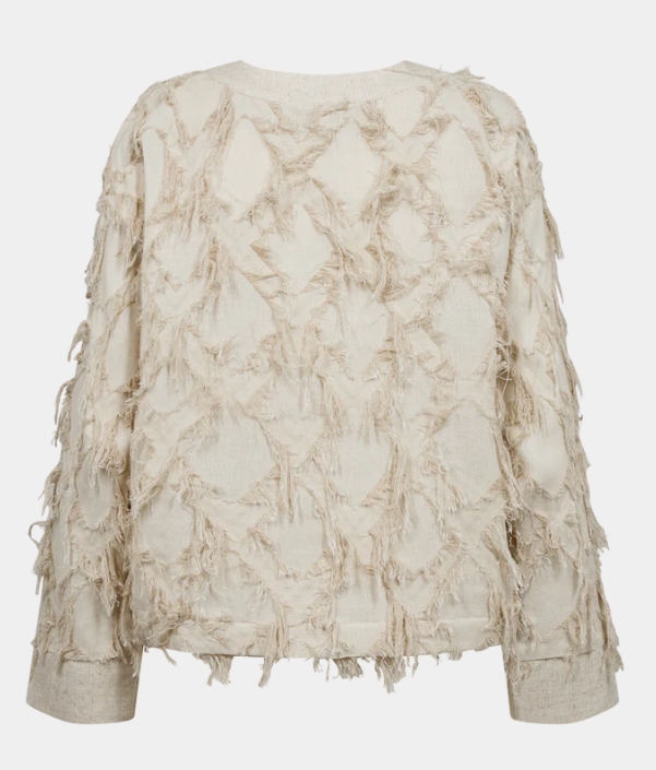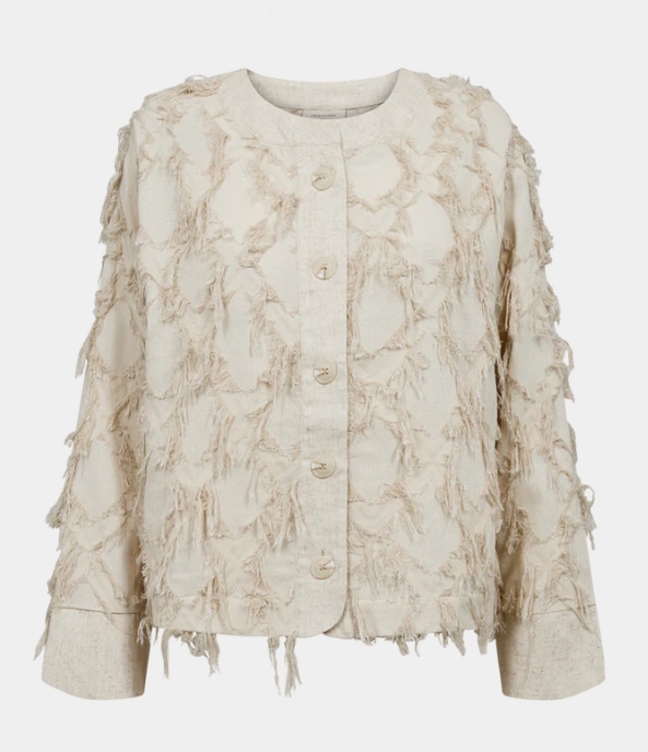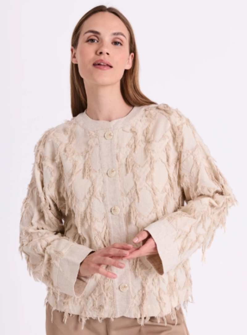 Elegant, ljusbeige jacka i linnematerial med dekorativ struktur och vackra fransdetaljer som skapar ett exklusivt och levande uttryck. Den raka modellen kombineras med knäppning framtill och generösa ärmar för en modern silhuett. Ett stilfullt statement-plagg som lyfter både vardag och fest. Går att användas som både jacka och kofta och lika snygg uppknäppt som knäppt.