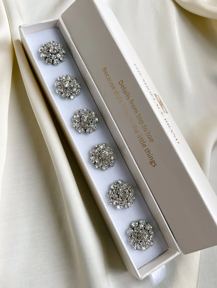 Ett knappskydd som ger omedelbar glitter och tidlös elegans. Klicka det över en knapp (upp till 13 mm i diameter) och låt din outfit skina.