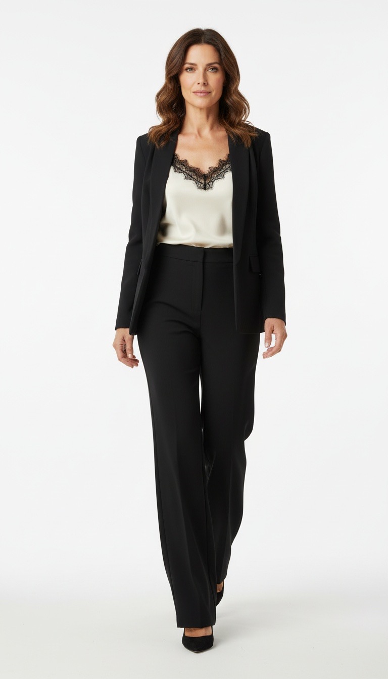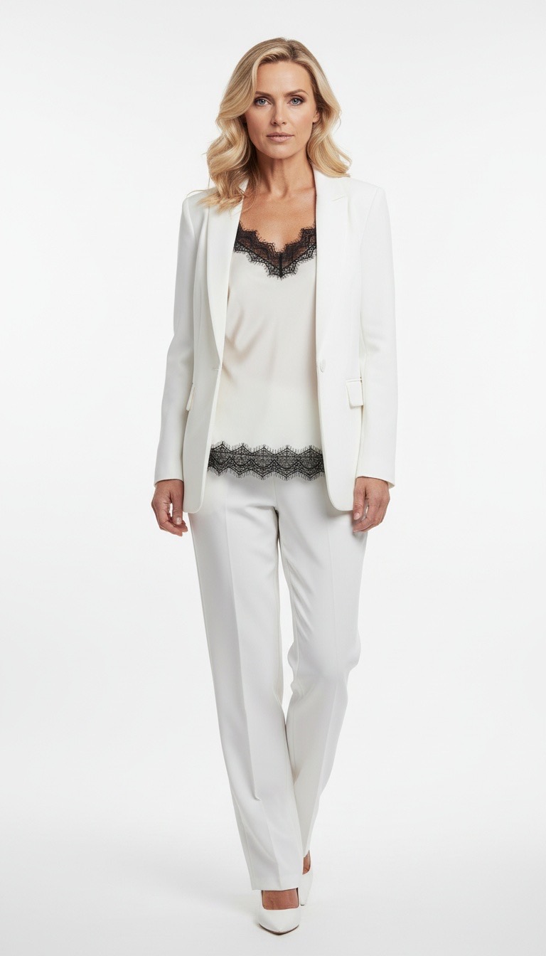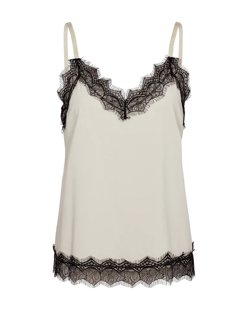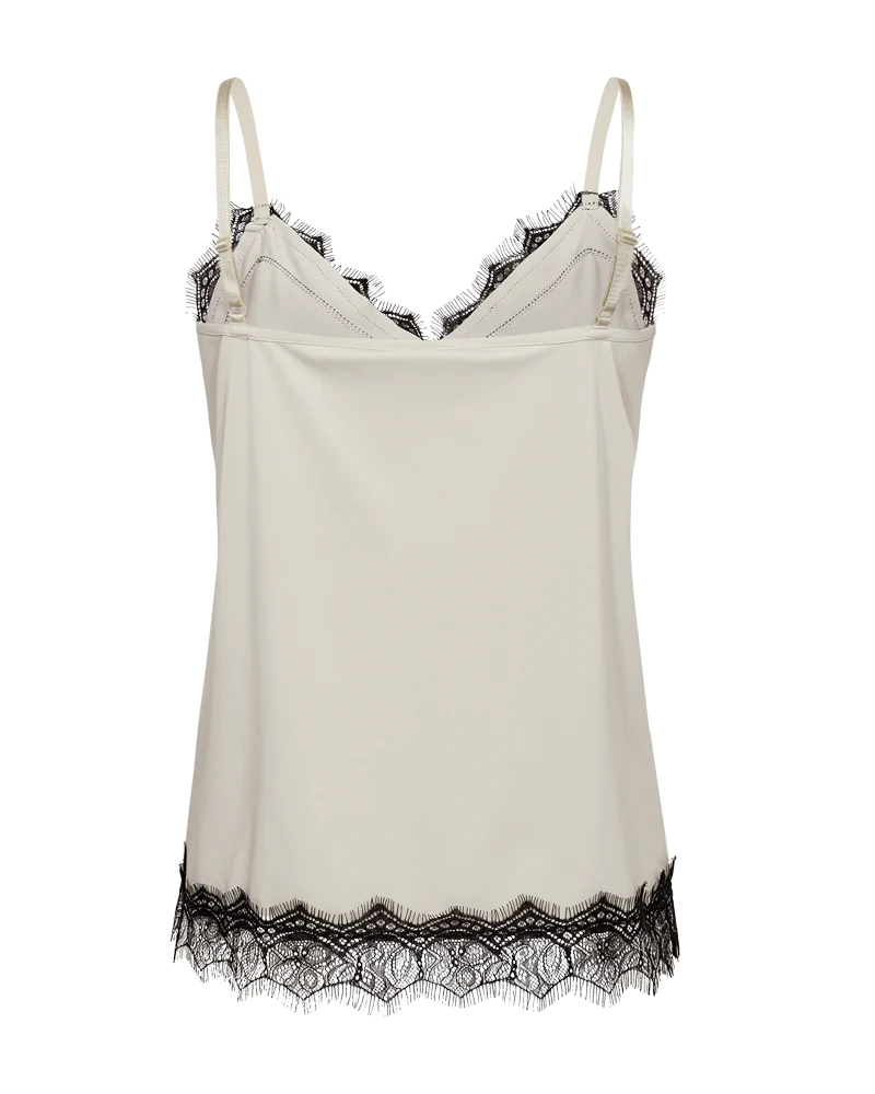 Topp i ett mjukt material. Toppen har en enkel silhuett med V-ringning, spetsdetaljer och justerbara, tunna axelband.