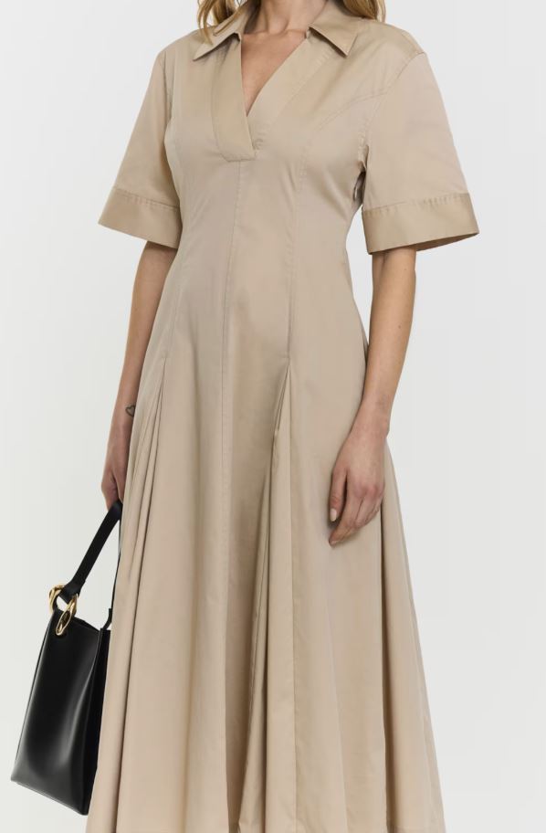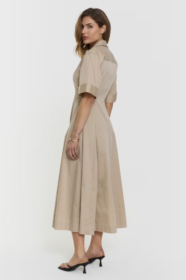 Lou-klänningen erbjuder en raffinerad och modern version av den klassiska skjortklänningen. Den har korta, vida ärmar, en dold dragkedja och en fin insats vid kjolen för extra form och rörelsefrihet. Midilängden fulländar den rena, strukturerade silhuetten.