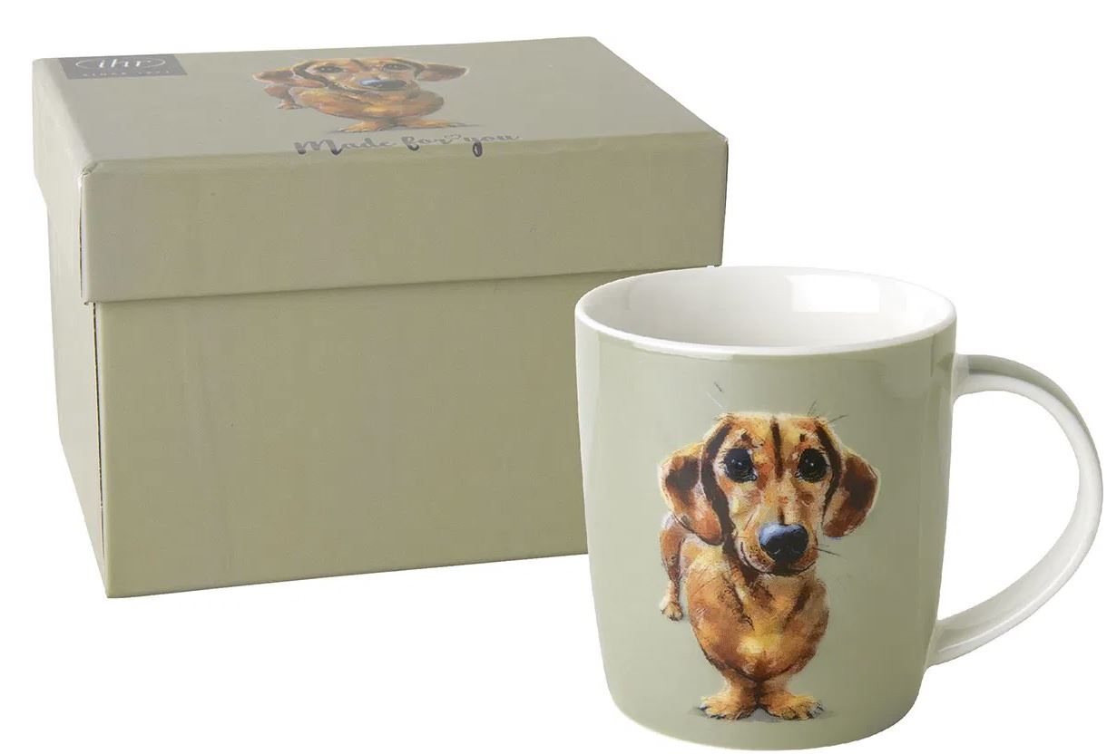En charmig mugg med motiv av en brun tax. Den detaljrika illustrationen ger en varm och personlig känsla. Perfekt för kaffe eller te – en fin present till alla hundälskare.