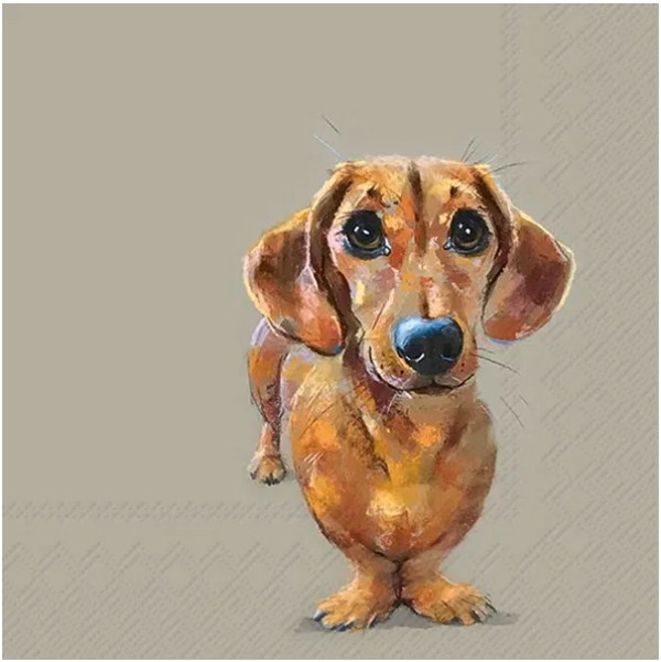 En dekorativ servett med ett lekfullt motiv av en tax i varma, mjuka färgtoner. Den konstnärliga illustrationen och de uttrycksfulla ögonen ger en charmig och personlig känsla.