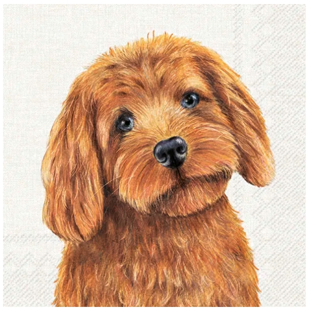 En dekorativ servett med ett charmigt motiv av en brun hund med mjuk, lockig päls och uttrycksfull blick. Den varma färgskalan och detaljrika illustrationen ger en inbjudande och personlig känsla.