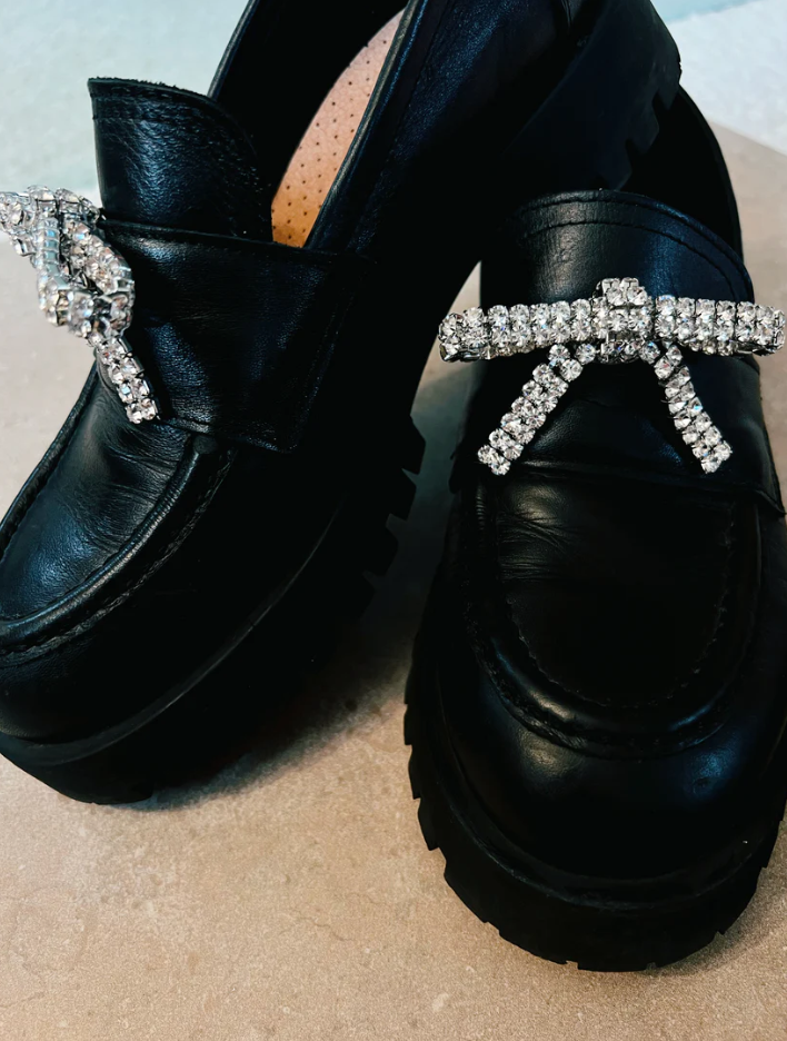 Glittrande och elegant svart kristallrosett som omedelbart förvandlar vilken sko som helst till ett iögonfallande stycke. Rosetten är 8 cm bred och 4 cm hög, designad för att ge maximal glans utan att kännas tung. På baksidan hittar du två säkra skoklämmor som enkelt fästs på pumps, loafers, sandaler, sneakers – eller till och med på en väskrem som en snygg accessoar.